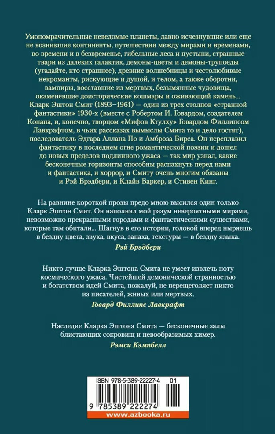Умопомрачительные неведомые планеты, давно исчезнувшие или еще не возникшие континенты, путешествия между мирами и временами, во времени и в безвременье, гибельные леса и пустыни, страшные твари из далеких галактик, демоны-цветы и демоны-трупоеды (угадайте, кто страшнее), древние волшебницы и честолюбивые некроманты, рискующие и душой, и телом, а также оборотни, вампиры, восставшие из мертвых, безымянные чудовища, окаменевшие доисторические кошмары и оживающий камень… Кларк Эштон Смит (1893–1961) — один из трех столпов «странной фантастики» 1930-х (вместе с Робертом И. Говардом, создателем Конана, и, конечно, творцом «Мифов Ктулху» Говардом Филлипсом Лавкрафтом, в чьих рассказах вымыслы Смита то и дело гостят), последователь Эдгара Аллана По и Амброза Бирса. Он переплавил фантастику в последнем огне романтической поэзии и дошел до новых пределов подлинного ужаса — так мир узнал, какие бесконечные горизонты способны распахнуть перед нами и фантастика, и хоррор, и Смиту очень многим обязаны и Рэй Брэдбери, и Клайв Баркер, и Стивен Кинг. В этом сборнике представлены рассказы 1925–1931 годов;