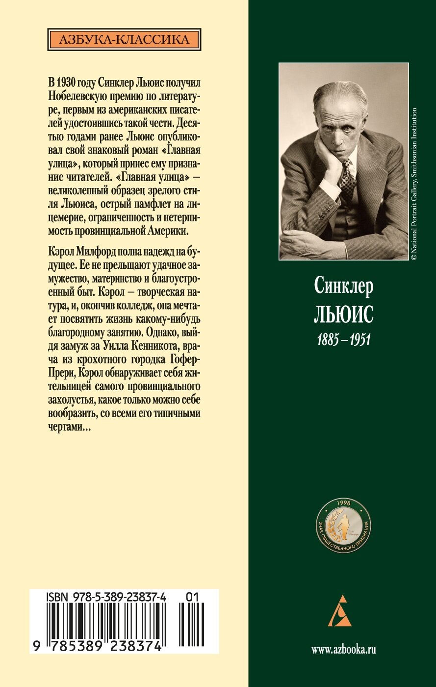 В 1930 году Синклер Льюис (1885–1951) получил Нобелевскую премию по литературе, первым из американских писателей удостоившись такой чести. Десятью годами ранее Льюис опубликовал свой знаковый роман «Главная улица», который принес ему признание читателей. «Главная улица» — великолепный образец зрелого стиля Льюиса, острый памфлет на лицемерие, ограниченность и нетерпимость провинциальной Америки. Кэрол Милфорд полна надежд на будущее. Ее не прельщают удачное замужество, материнство и благоустроенный быт. Кэрол — творческая натура, и, окончив колледж, она мечтает посвятить жизнь какому-нибудь благородному занятию. Однако, выйдя замуж за Уилла Кенникота, врача из крохотного городка Гофер-Прери, Кэрол обнаруживает себя жительницей самого провинциального захолустья, какое только можно себе вообразить, со всеми его типичными чертами…