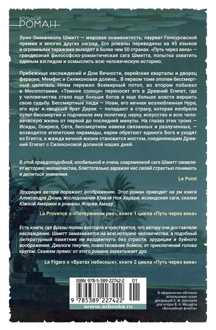 Эрик-Эмманюэль Шмитт — мировая знаменитость, лауреат Гонкуровской премии и многих других наград. Его роман «Оскар и Розовая Дама» читатели назвали книгой, изменившей их жизнь, наряду с Библией, «Маленьким принцем» и «Тремя мушкетерами». Его романы переведены на 45 языков и огромными тиражами выходят в более чем 50 странах. «Путь через века» — грандиозная философско-романтическая сага Шмитта, попытка охватить единым взглядом и осмыслить всю человеческую историю. Прибежище наслаждений и Дом Вечности, еврейские кварталы и дворец фараона, Мемфис и Силиконовая долина… В первой книге эпопеи бессмертный целитель Ноам пережил Всемирный потоп, во втором побывал в Месопотамии. «Темное солнце» переносит его в Древний Египет, где у человечества стало еще больше богов и еще больше власти вершить свою судьбу. Бессмертные люди — Ноам, его вечная возлюбленная Нура, его враг и сводный брат Дерек — попадают в страну, которая изобрела культ бессмертия и подчинила ему политику, науку, искусство и всю человеческую жизнь от первой до последней минуты. На глазах этих троих — Исиды, Осириса, Сета, бессмертием навеки связанных и разлученных, — возводятся египетские пирамиды, евреи обретают единого Бога и уходят из Египта, а жажда вечной жизни становится мостом, соединяющим Древний Египет с Силиконовой долиной наших дней. Впервые на русском!