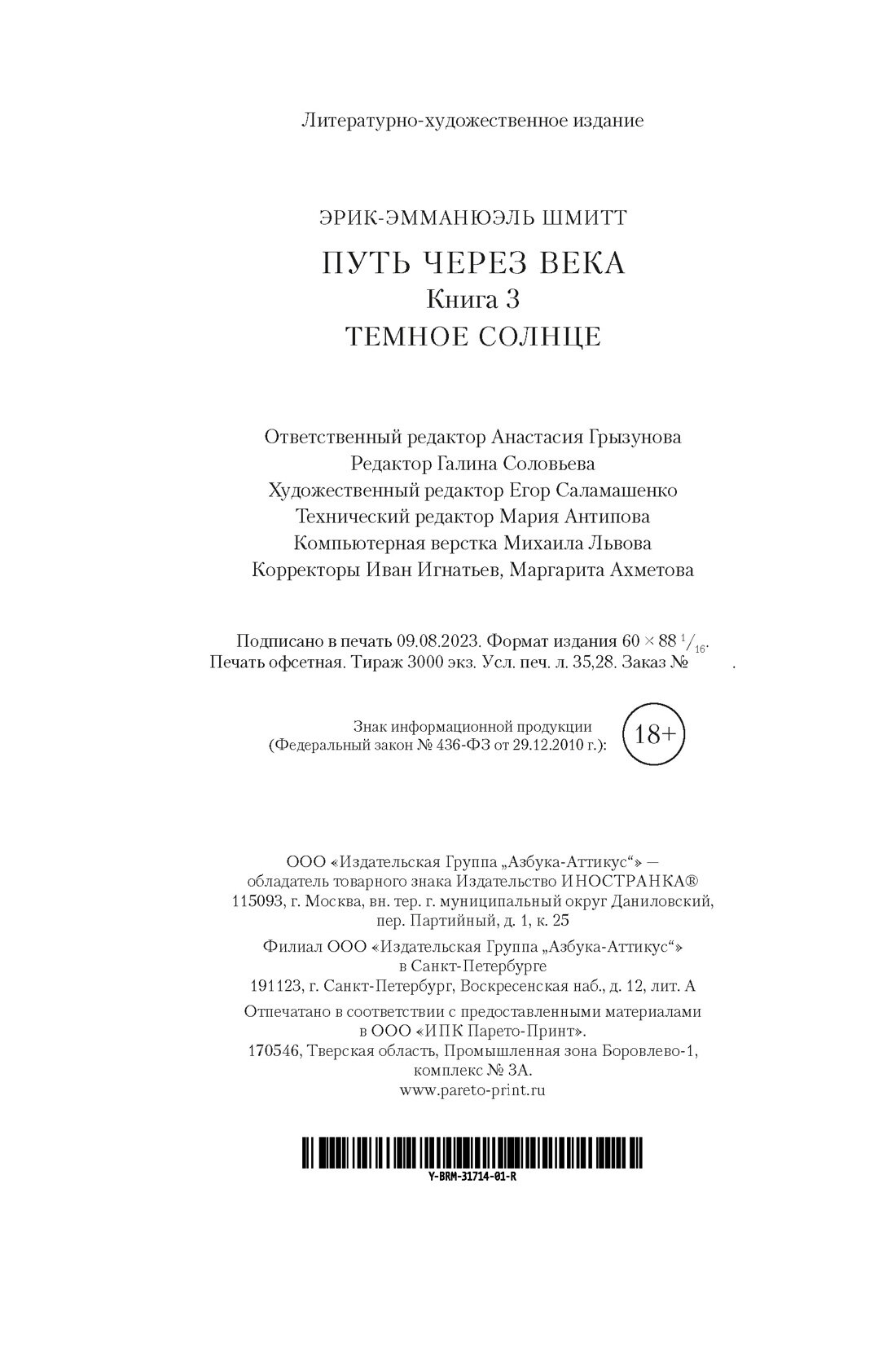 Путь через века. Книга 3. Темное солнце (Эрик-Эмманюэль Шмитт); Иностранка, 2023