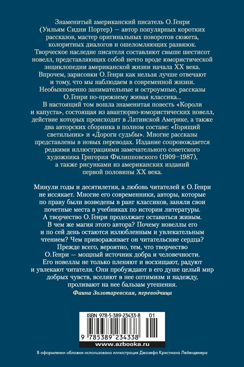 Знаменитый американский писатель О. Генри (Уильям Сидни Портер) — автор популярных коротких рассказов, мастер оригинальных поворотов сюжета, колоритных диалогов и ошеломляющих развязок. Творческое наследие писателя составляют свыше шестисот новелл, представляющих собой нечто вроде юмористической энциклопедии американской жизни начала ХХ века. Впрочем, зарисовки О. Генри как нельзя лучше отвечают и тому, что мы наблюдаем в современной жизни. Необыкновенно занимательные и остроумные, рассказы О. Генри по-прежнему живая классика… В настоящий том вошла знаменитая повесть «Короли и капуста», состоящая из авантюрно-юмористических новелл, действие которых происходит в Латинской Америке, а также два авторских сборника в полном составе: «Горящий светильник» и «Дороги судьбы». Многие рассказы представлены в новых переводах. Издание сопровождается редкими иллюстрациями замечательного советского художника Григория Филипповского (1909–1987), а также рисунками из американских изданий первой половины XX века.