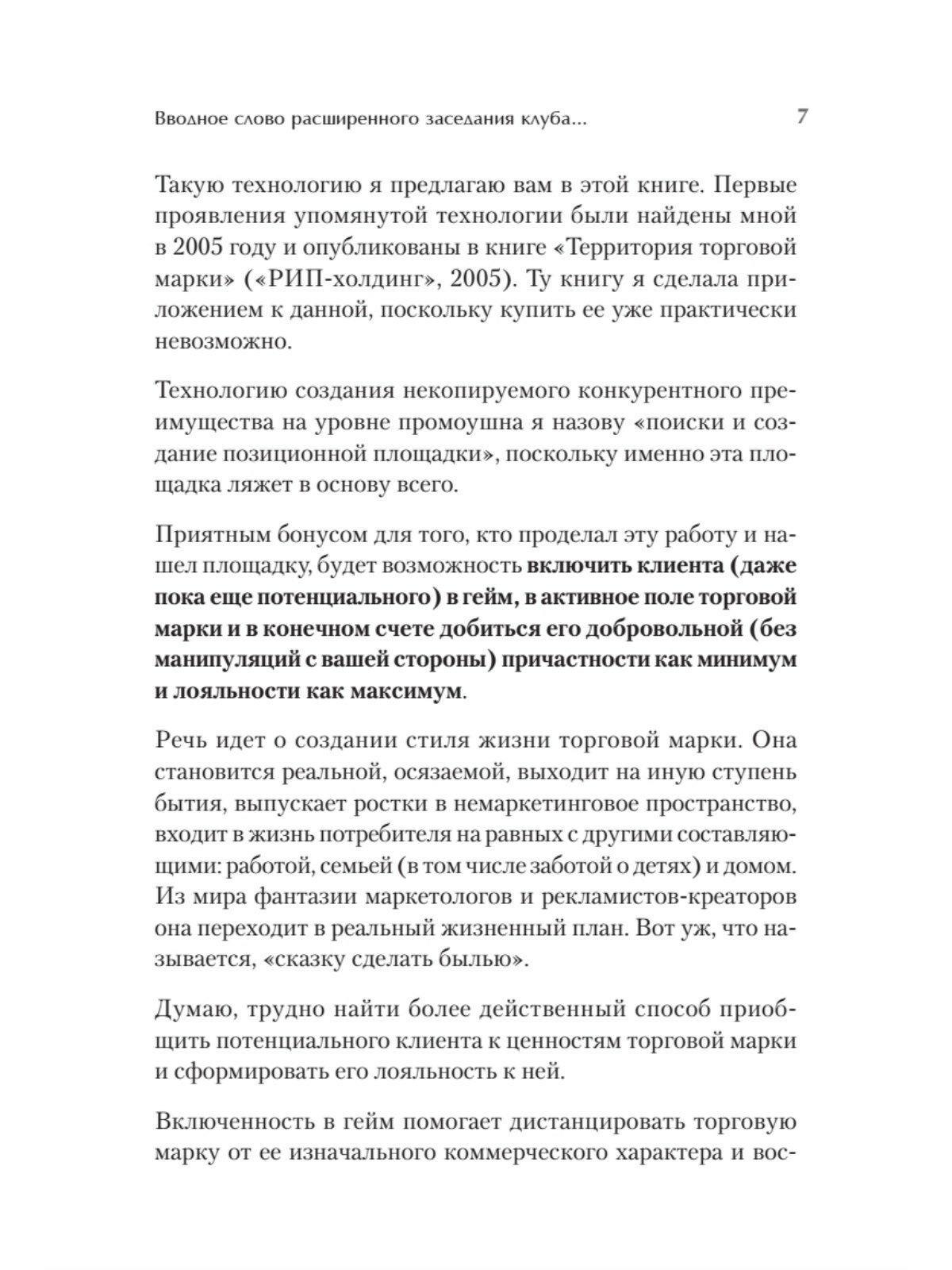 В маркетинге можно скопировать почти все: цену, продукт, каналы товародвижения. Единственное, что остается неизменным – это история ваших взаимоотношений с клиентом, действия и эмоции – ваш общий гейм.Предложите клиенту уникальную историю взаимодействий, и вы получите особое конкурентное преимущество, ведь с другим брендом у клиента все будет по-другому.В книге представлена авторская модель системного продвижения, которая показывает, что раскручивать бренд можно одновременно и эффективно, и малобюджетно. В основу методики заложены поиск и создание позиционной площадки, что позволит включить клиента в игру и добиться его лояльности.Вы узнаете, как создать особый стиль жизни имени вашей торговой марки и дистанцировать ее от коммерческого восприятия. А также определите, какие ивенты должны происходить в созданном сообществе, чтобы оправдать ожидания клиентов.Издание адресовано маркетологам, владельцам малого и среднего бизнеса, самозанятым, а также преподавателям маркетинга и маркетинговых коммуникаций.
