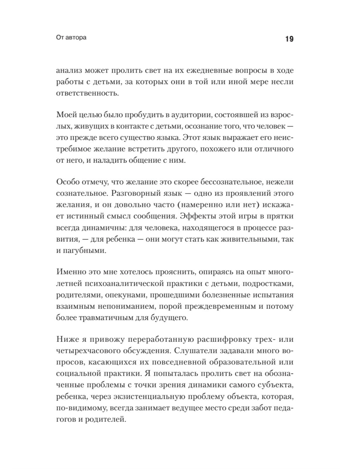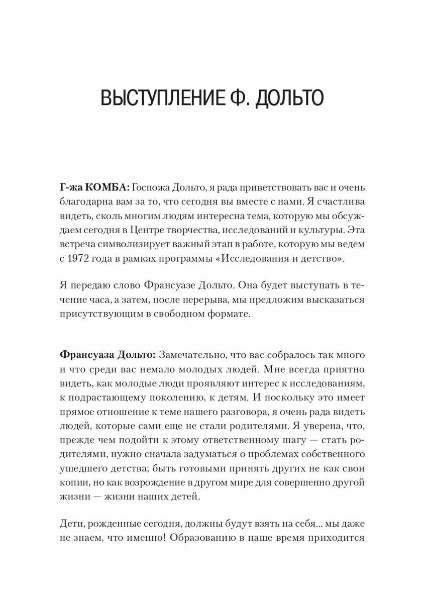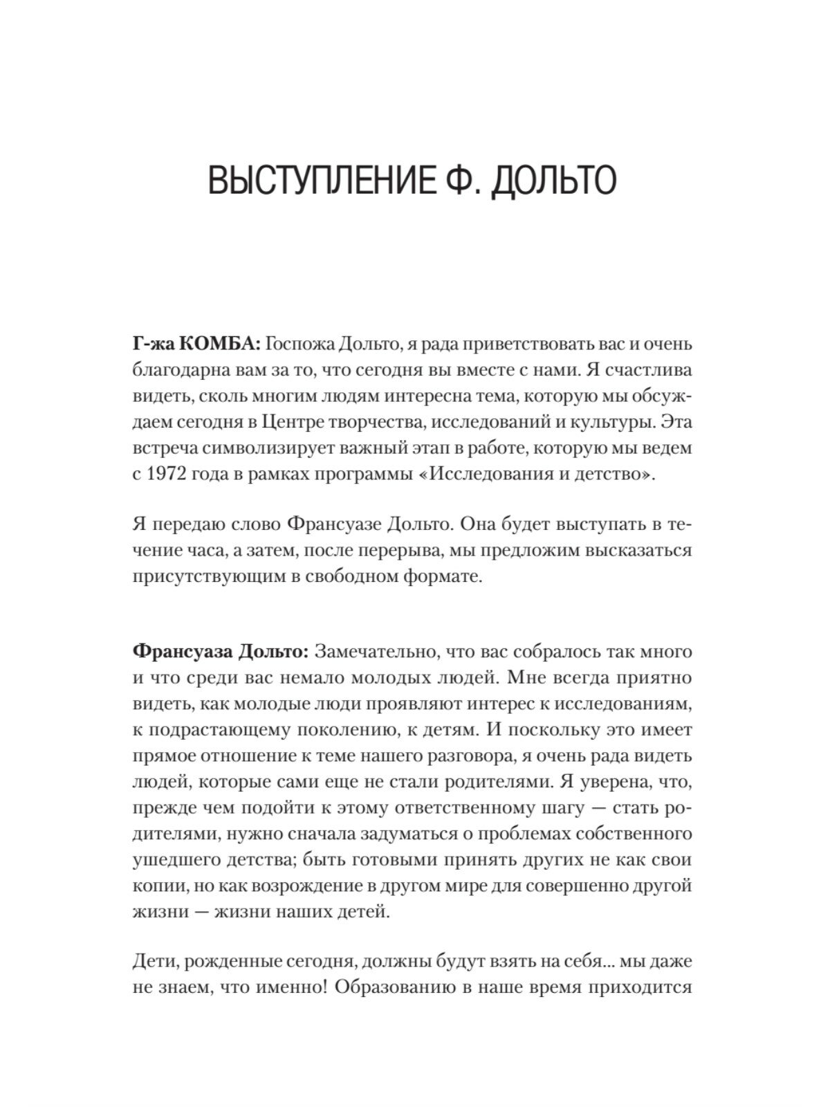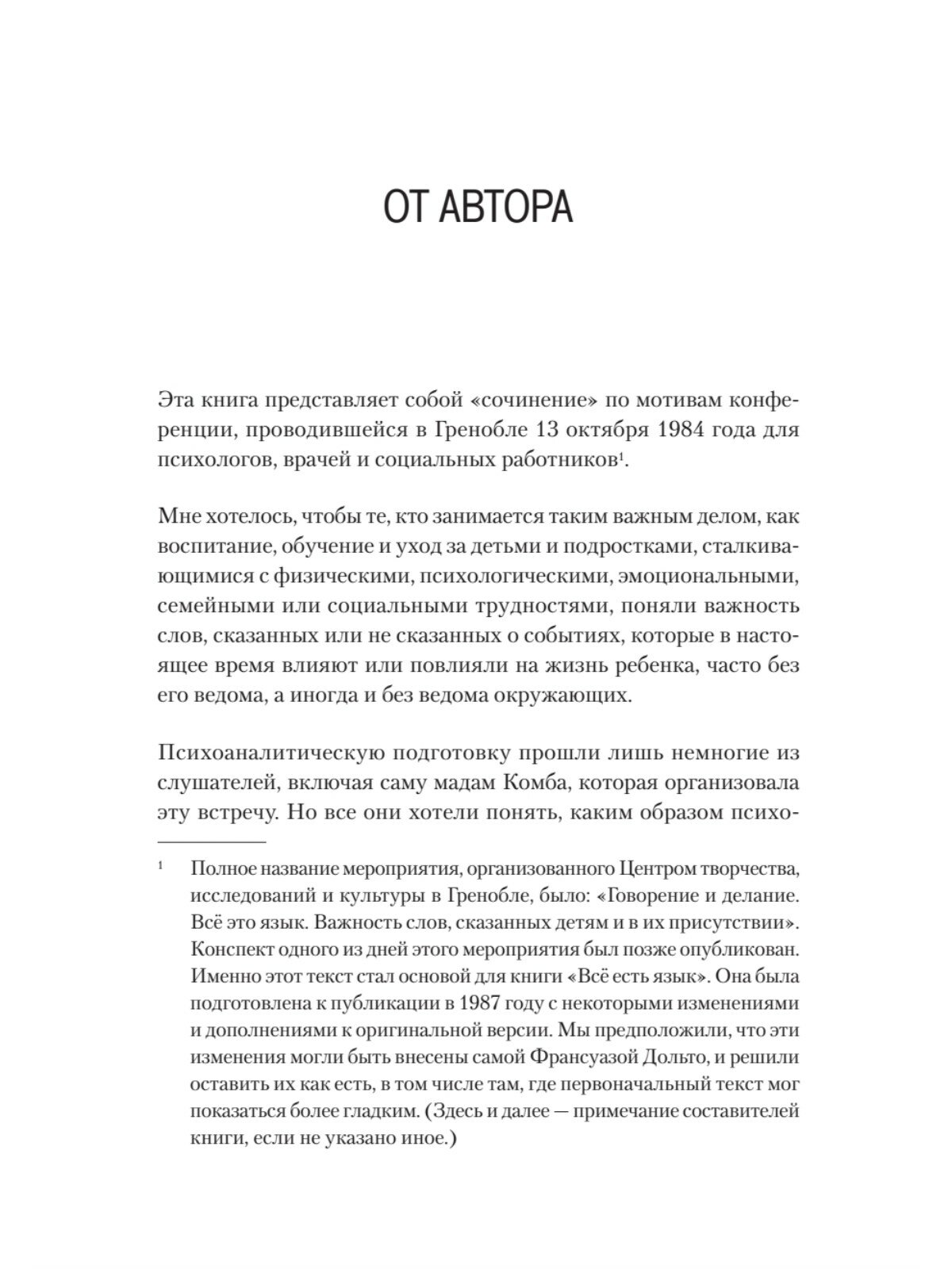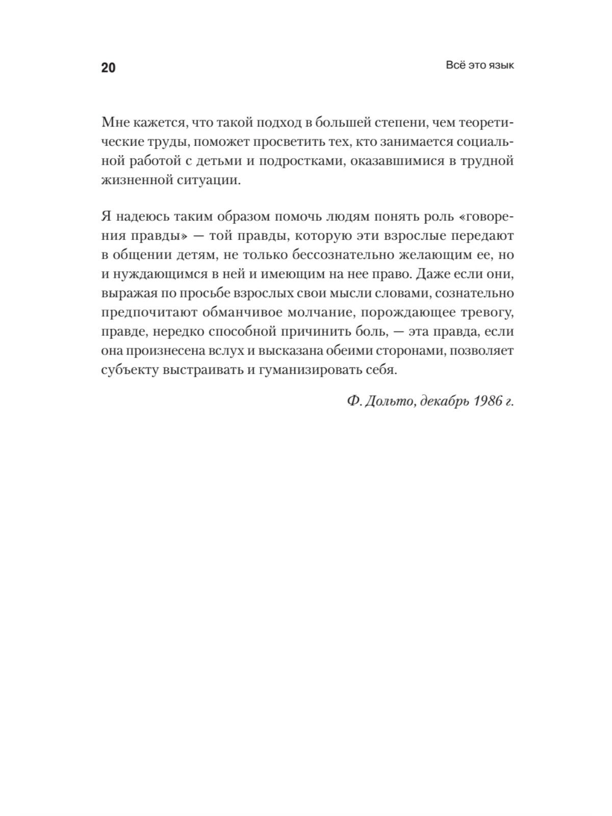 В этой книге, составленной по материалам одной из психоаналитических конференций с участием Дольто, описываются все нюансы языка, которым взрослые общаются с детьми, а дети с взрослыми. Что бы ребенок ни делал, по сути, это его слова, которые через его действия нужно услышать, причем буквально. Таким образом можно узнать о чувствах, которые ребенок не может сформулировать и вербализировать, чувствах, которые возникают у него, когда он сталкивается с ложью, недоговариванием и избегающим молчанием взрослых. Дольто описывает и интерпретирует язык детей, чтобы родители умели распознавать страдание ребенка и находить нужные слова, способные избавить его от "ненужной боли".