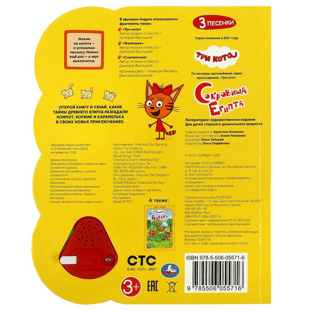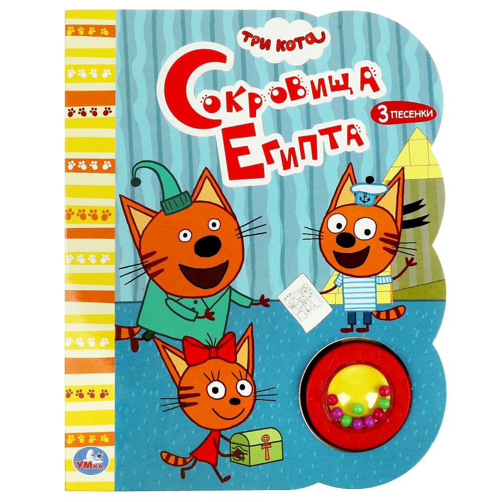 Три кота. Сокровища Египта. Музыкальная книга. 1 звуковая кнопка с погремушкой 3 песенки (без автора); Умка, 2021