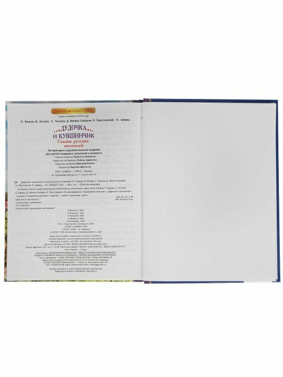 Сервис сравнения цен СкидкаГИД предлагает сравнить цены на товар «Книга: Дудочка и кувшинчик. Сказки русских писателей (Катаев Валентин Петрович,Бажов Павел Петрович,Козлов Сергей Григорьевич); Умка, 2021»