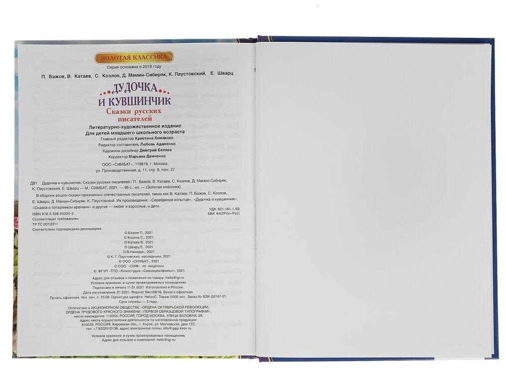 Книга. Золотая классика. Дудочка и кувшинчик. Сказки русских писателей, ТМ «УМка»:- замечательные сказки П. Бажова, Д. Мамина-Сибиряка, В. Катаева, Е. Шварца, К. Паустовского и др.- сказки по мотивам известных мультфильмов- яркие крупные иллюстрации- твёрдый переплётОбъём: 96 стр. Формат: 197 х 255 мм (А4).Материал: бумага офсетная.Рекомендовано детям дошкольного возраста.