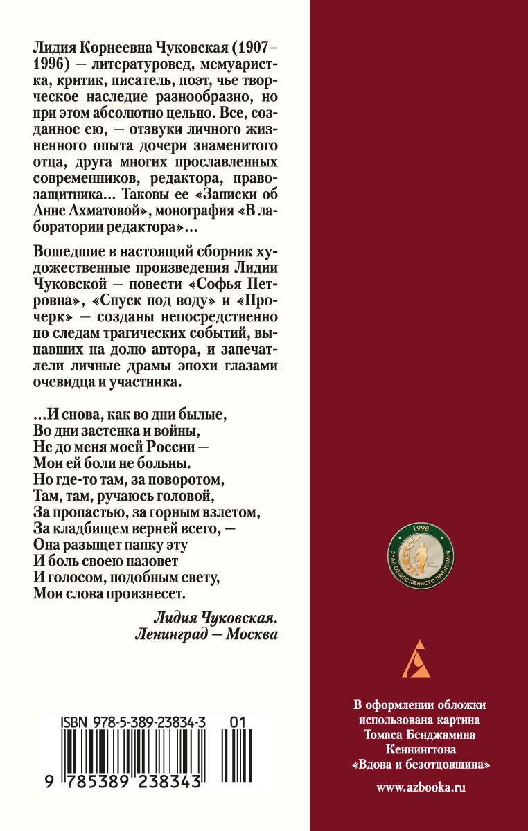 Лидия Корнеевна Чуковская (1907–1996) — литературовед, мемуаристка, критик, писатель, поэт, чье творческое наследие разнообразно, но при этом абсолютно цельно. Все, созданное ею, — отзвуки личного жизненного опыта дочери знаменитого отца, друга многих прославленных современников, редактора, правозащитника... Таковы ее «Записки об Анне Ахматовой», монография «В лаборатории редактора»… Вошедшие в настоящий сборник художественные произведения Лидии Чуковской — повести «Софья Петровна», «Спуск под воду» и «Прочерк» — созданы непосредственно по следам трагических событий, выпавших на долю автора, и запечатлели личные драмы эпохи глазами очевидца и участника.