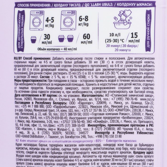 Внимание! Флакон с кондиционером следует хорошо встряхивать перед каждым применением! Для достижения наилучшего эффекта при полоскании махровых изделий дозировку средства рекомендуется увеличить в 1,5 раза. Если при стирке используется пятновыводитель или отбеливатель, то перед применением кондиционера бельё необходимо тщательно прополоскать в чистой воде. Неразбавленный кондиционер непосредственно на ткани лить не рекомендуется.