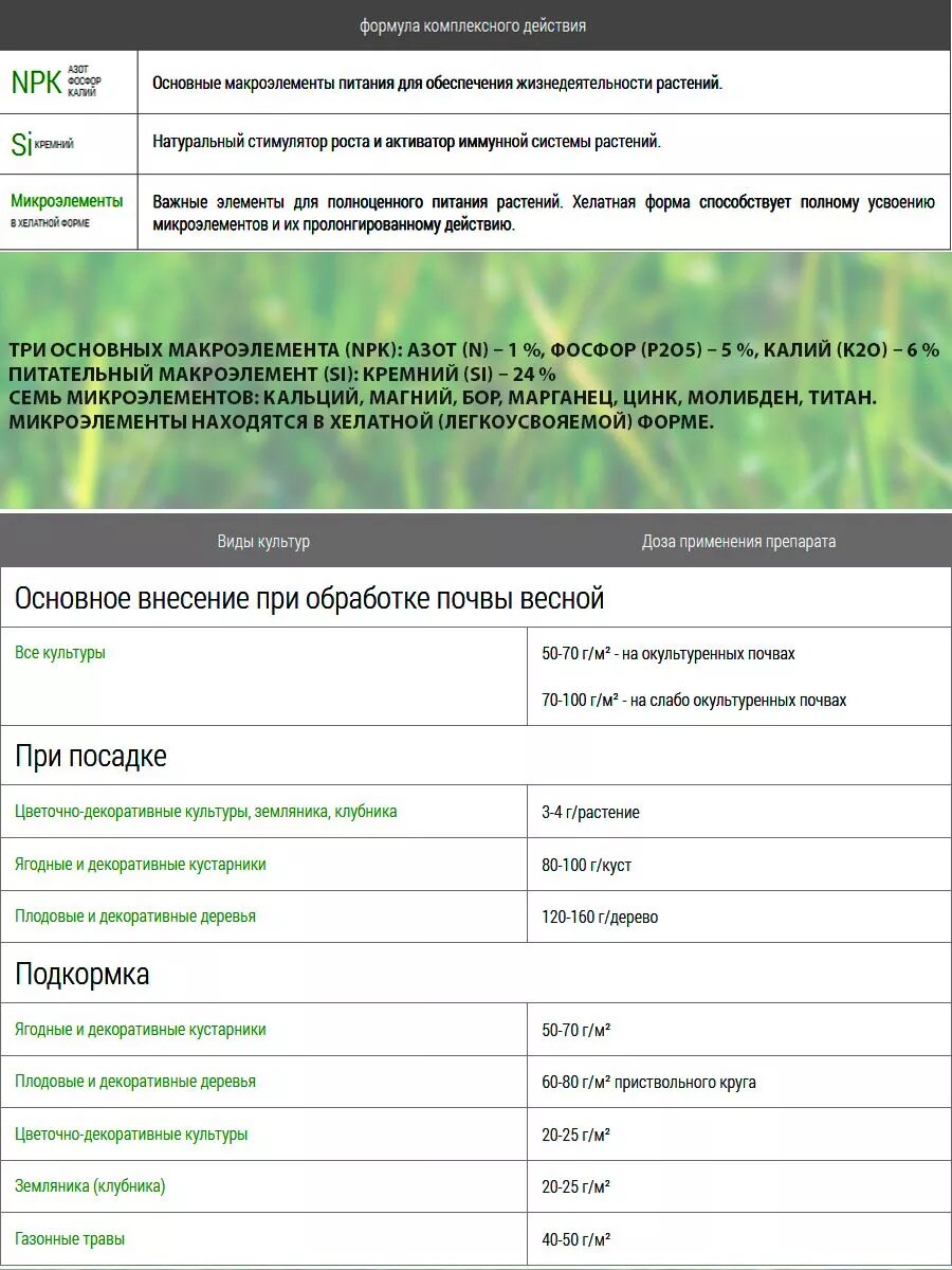 | Состав | Азот (N) – 1 %, фосфор (P2O5) – 5 %, калий (K2O) – 6 %.Кремний (Si) – 24 %Семь микроэлементов: кальций, магний, бор, марганец, цинк, молибден, титан.Микроэлементы находятся в хелатной (легкоусвояемой) форме. |
