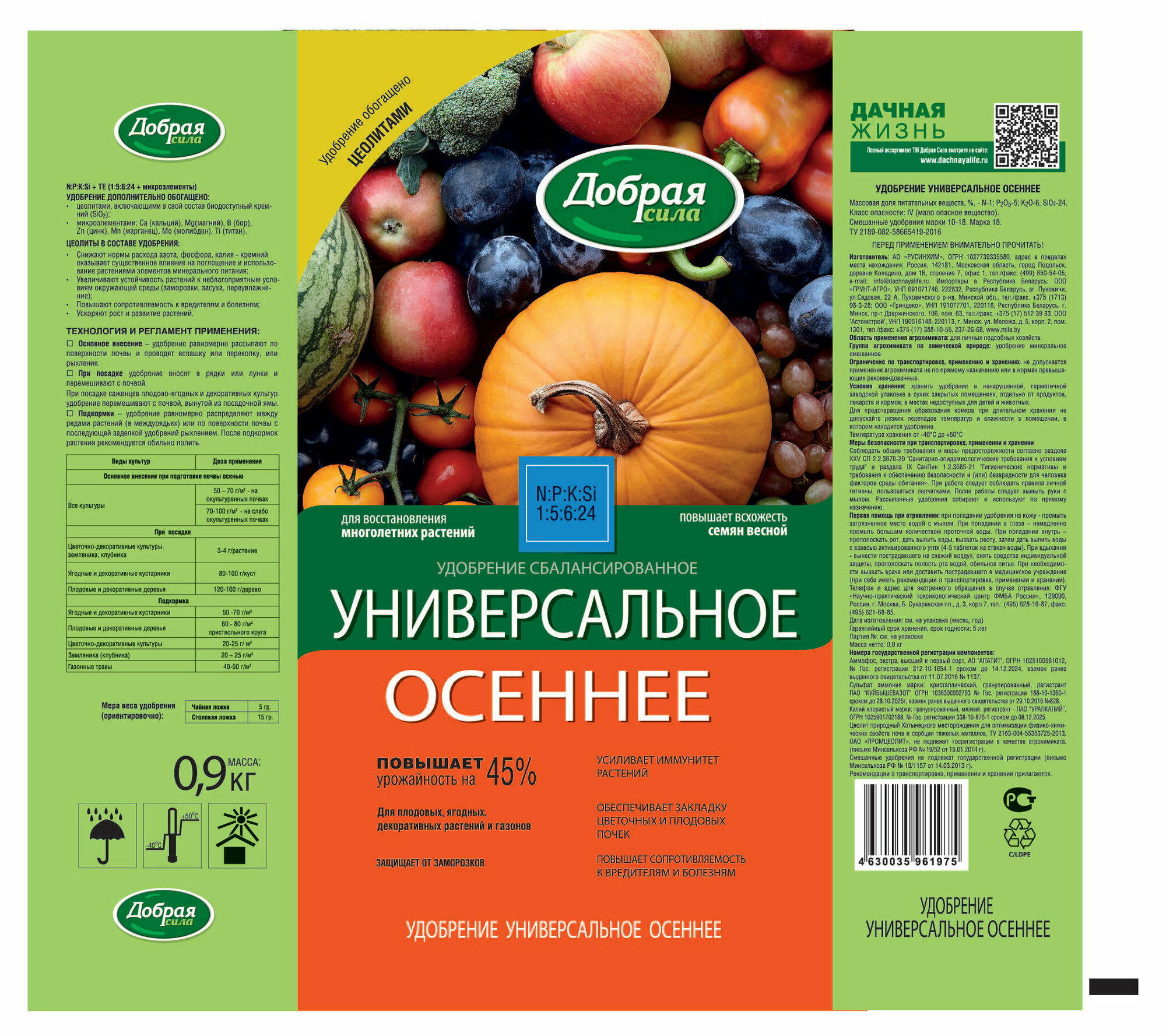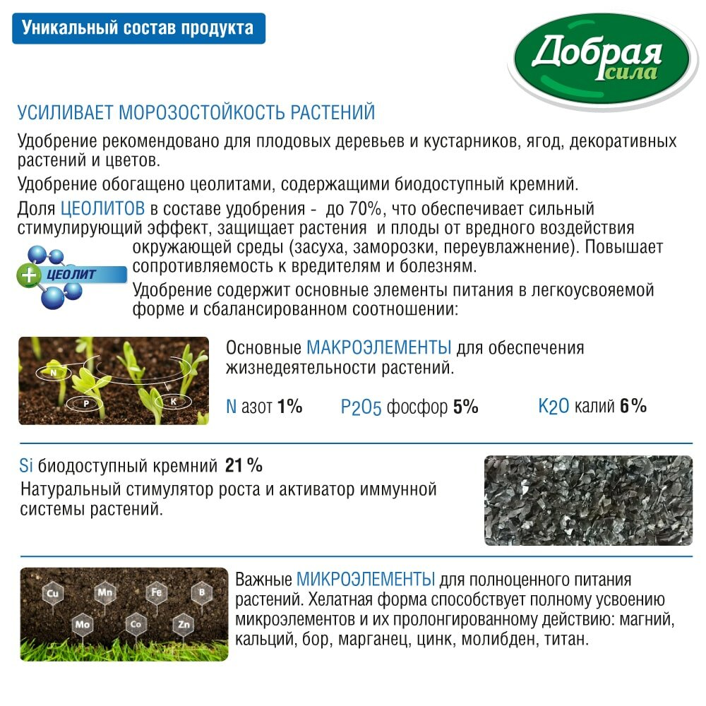 **Состав:** N:P:K:SI (1:5:6:24)+ TE (азот, фосфор, калий , биодостпуный кремний + 7 микроэлементов в легкоусвояемой форме - кальций, магний, бор, цинк, марганец, молибден, титан)