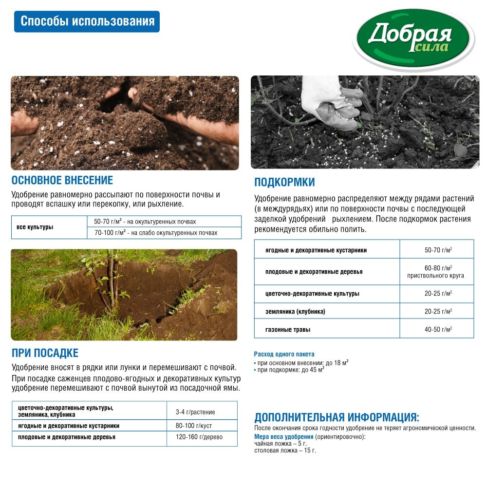 При посадке саженцев плодово-ягодных и декоративных культур удобрение перемешивают с почвой вынутой из посадочной ямы.