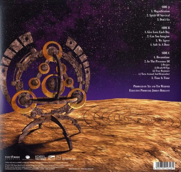 Лимитированное переиздание студийного альбома 2001 рок-группы Yes. Сторона D содержит гравировку. Британская рок-группа Yes была основана в 1968 году в Лондоне и в основном играет в жанрах прогрессив, симфони, арт и психодел-рок. За время своего существования коллектив постоянно менялся, но это не помешало группе достичь вершины славы и завоевать множество поклонников. Самыми популярными стали пластинки Tales from Topographic Oceans и Going for the One, которые заняли первые позиции британского чарта.