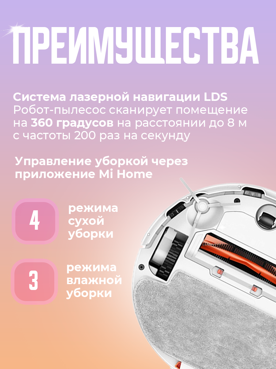 Xiaomi сочетает в себе функции сухой и влажной уборки, обеспечивая оптимальное качество очистки. Благодаря системе лазерной навигации LDS, пылесос сканирует помещение на 360° на расстоянии до 8 м с частотой 2000 раз в секунду, позволяя точно построить карту и безопасно передвигаться. Управление осуществляется через приложение Xiaomi Mi Home, где можно настроить график уборки, просмотреть прогресс, выбрать режим работы и многое другое.