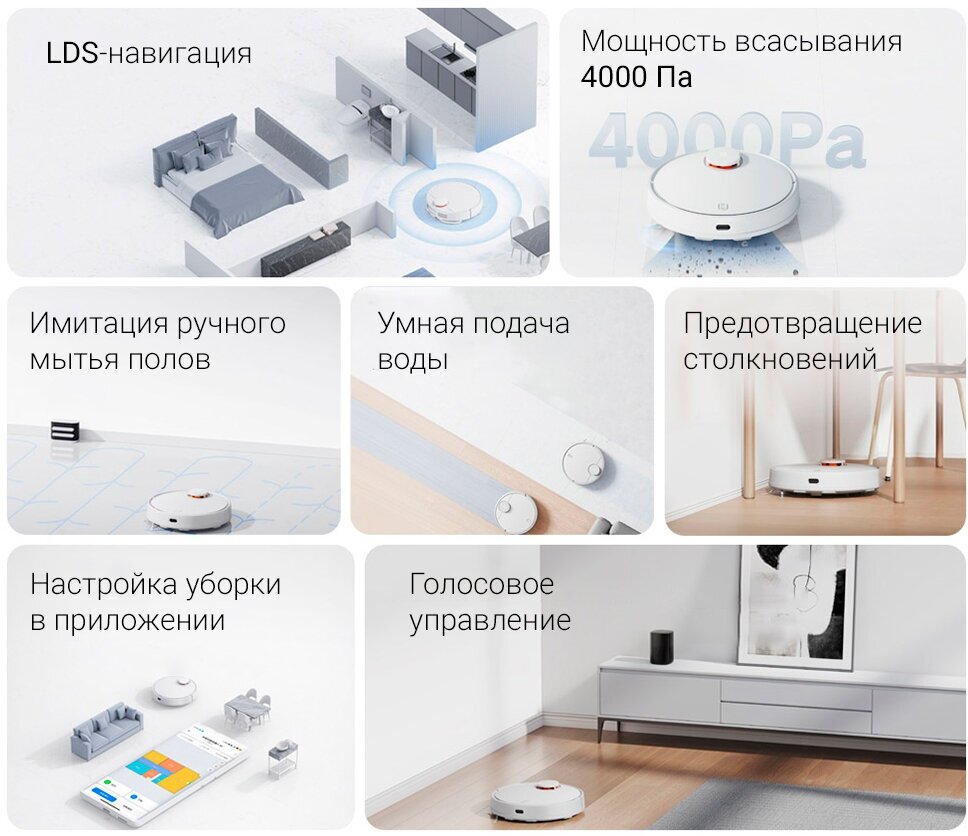 | Дополнительная информация | 3 уровня влажной уборки; отключение при перегреве; материал корпуса:пластик; мощность всасывания:4000 Па; сканирование 360° на дистанции до 8 м |