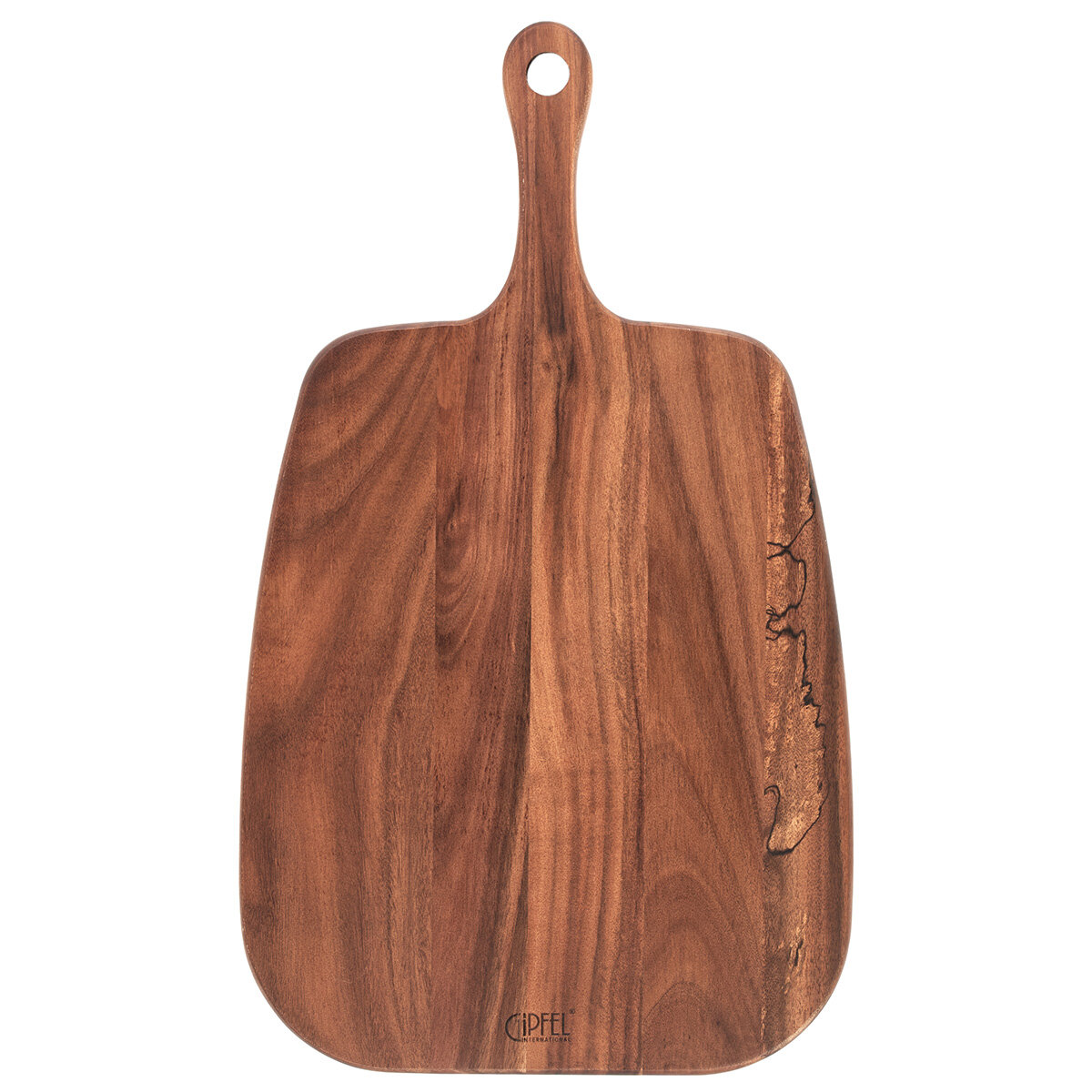 Данная доска прямоугольной формы с закругленными краями и рукояткой с отверстием для подвешивания. Текстура и цвет доски натурального дерева.