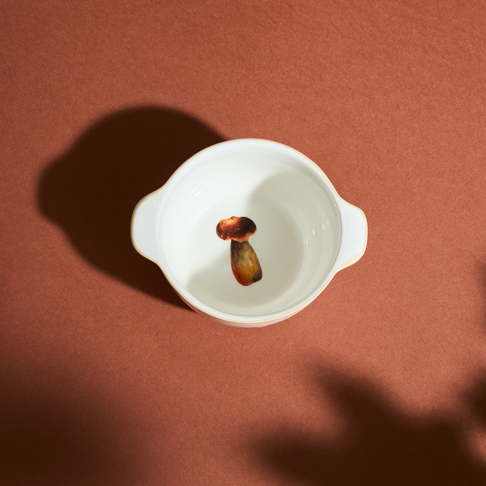 Фарфоровое блюдо от Cozy Home диаметром 10 см с ручками белого цвета с уютным растительным принтом - грибами и листьями.