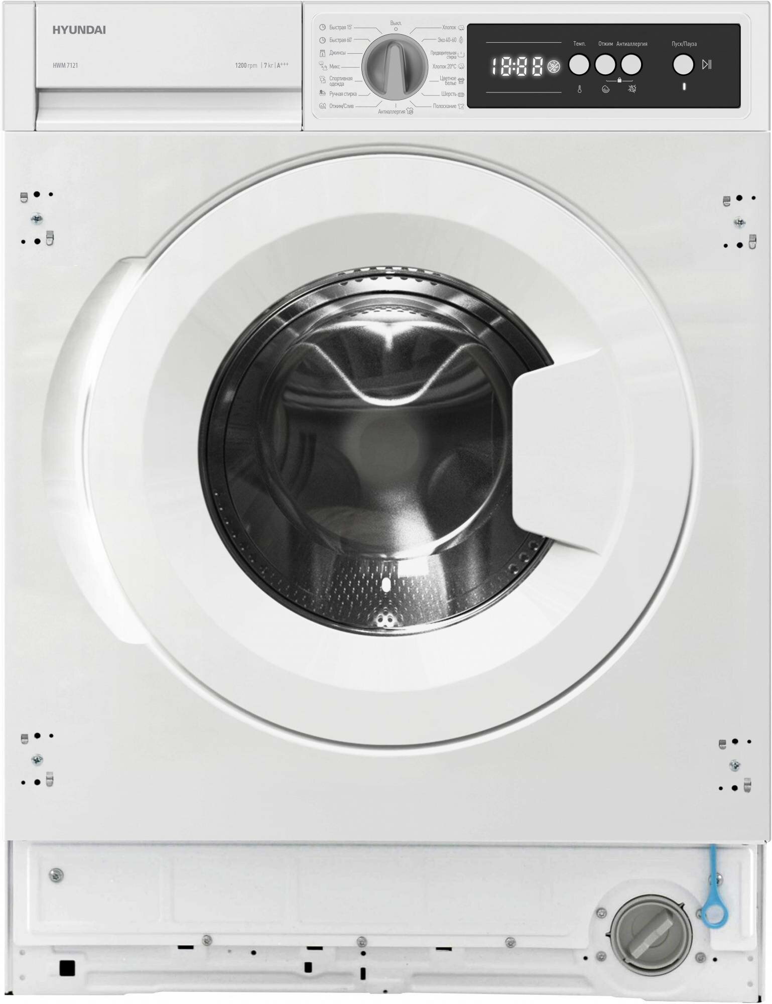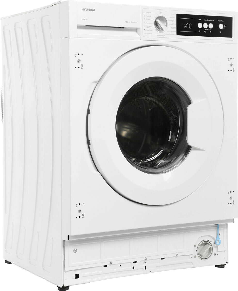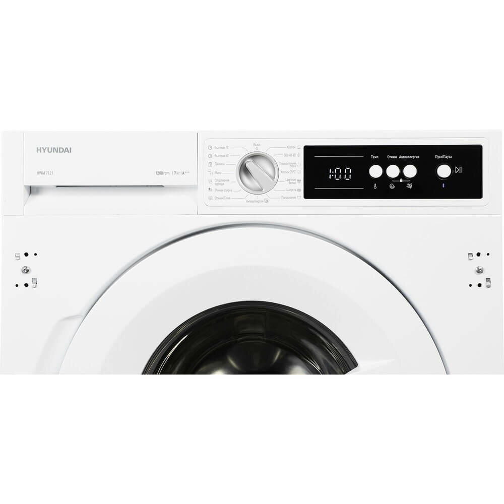 Встраиваемая стиральная машина Hyundai HWM 7121 белый, загрузка до 7кг, скорость отжима до 1200об/мин, материал барабана нержавеющая сталь, защита от протечек частичная (шланг для заливки воды)