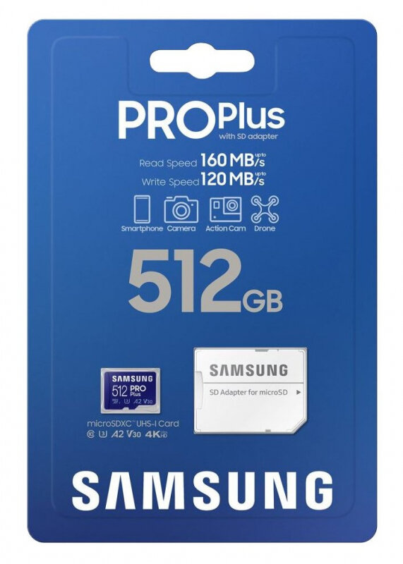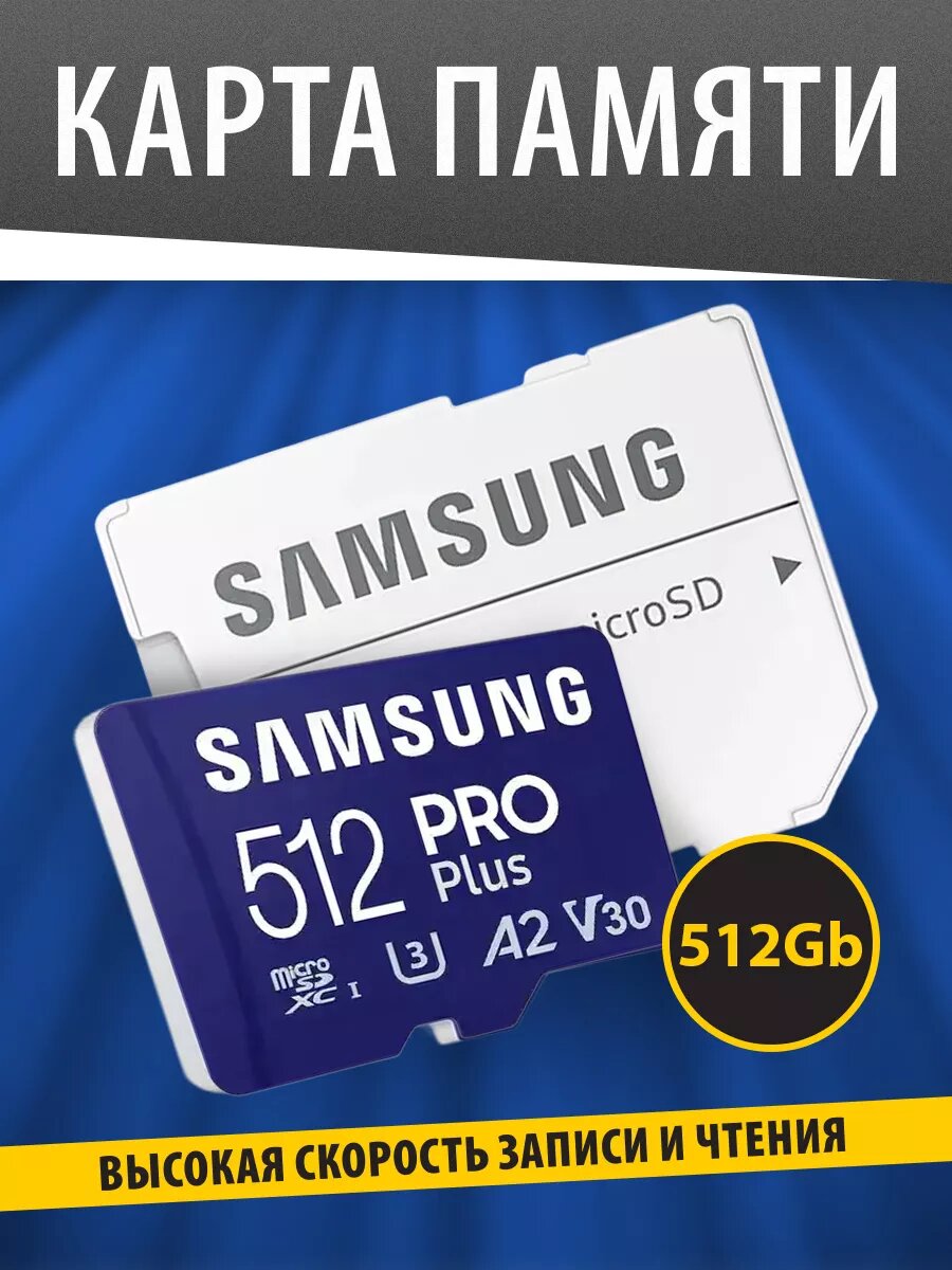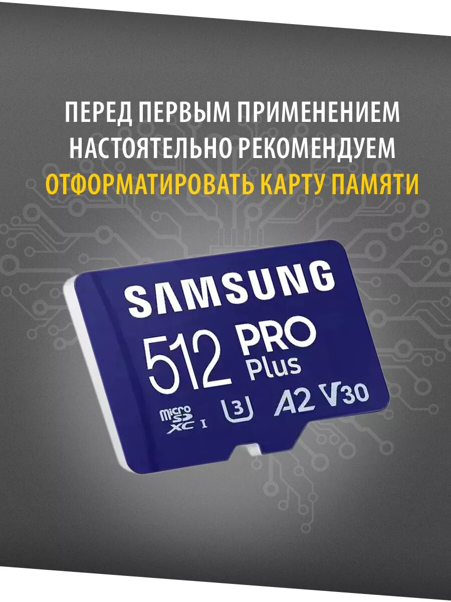 Флеш карта microSDXC 512GB Samsung PRO Plus Class 10, A2, V30, UHS-I (U3), W 130 МБ/с, R 180 МБ/с, адаптер на SD