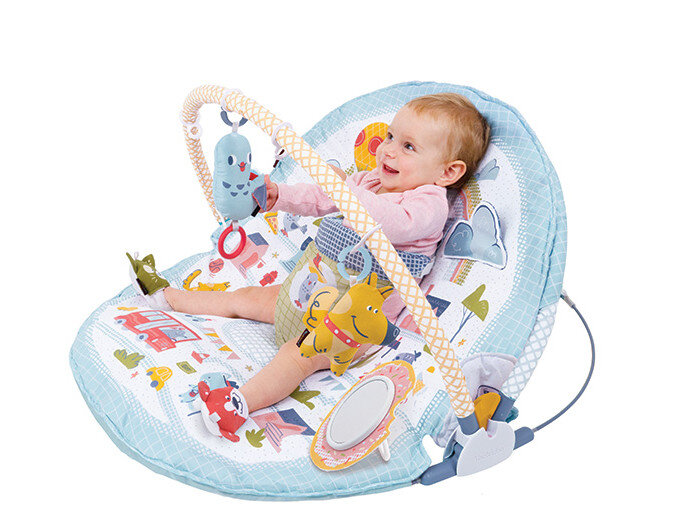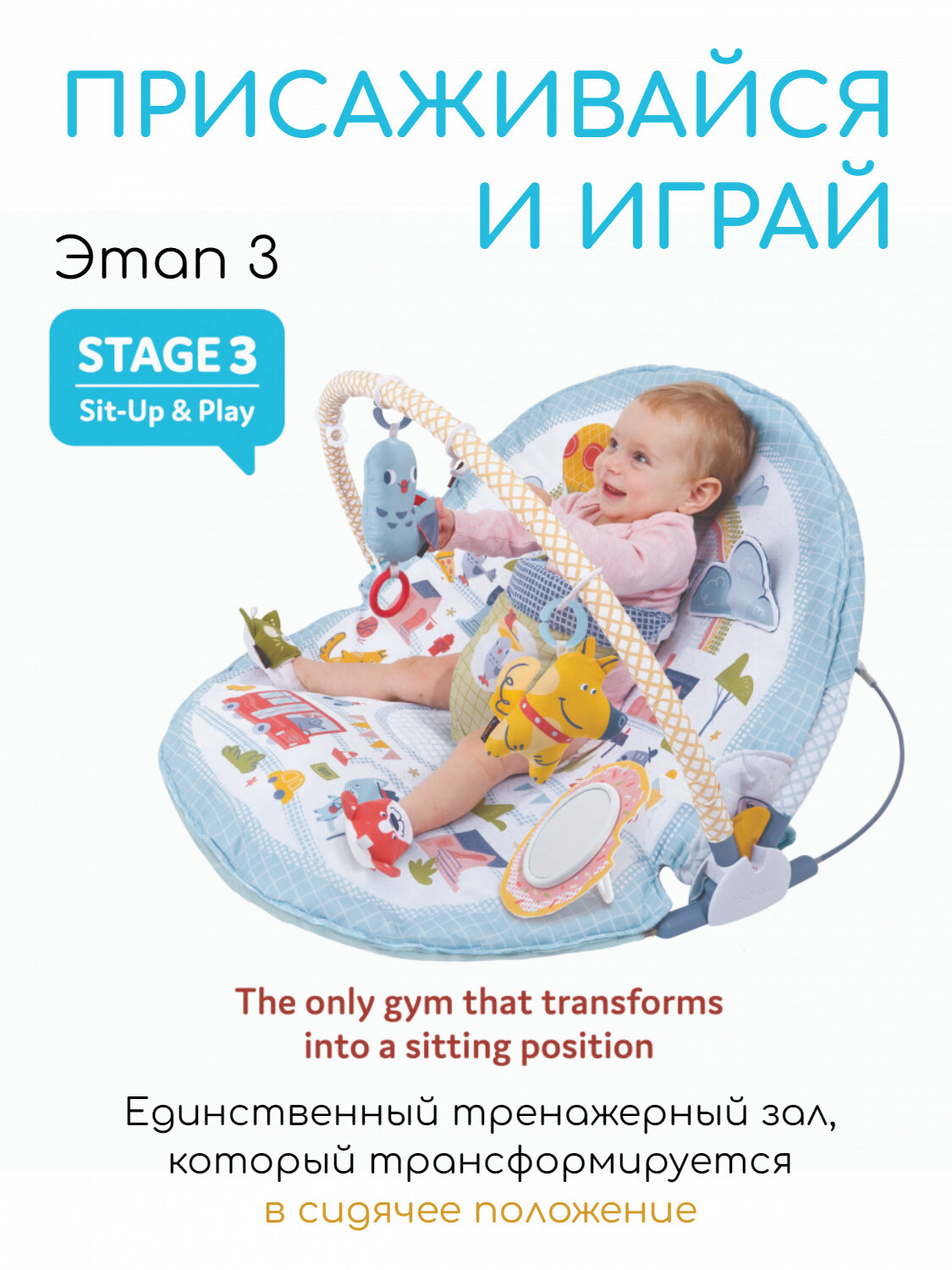 Специальное крепление для поддержки ребенка в сидячем положении обеспечивает безопасность и комфорт. Коврик включает более 20 видов активности для малыша.