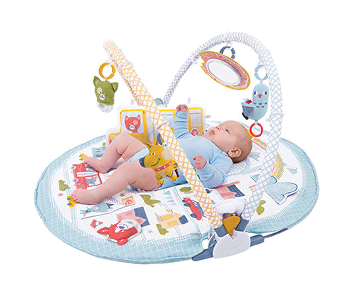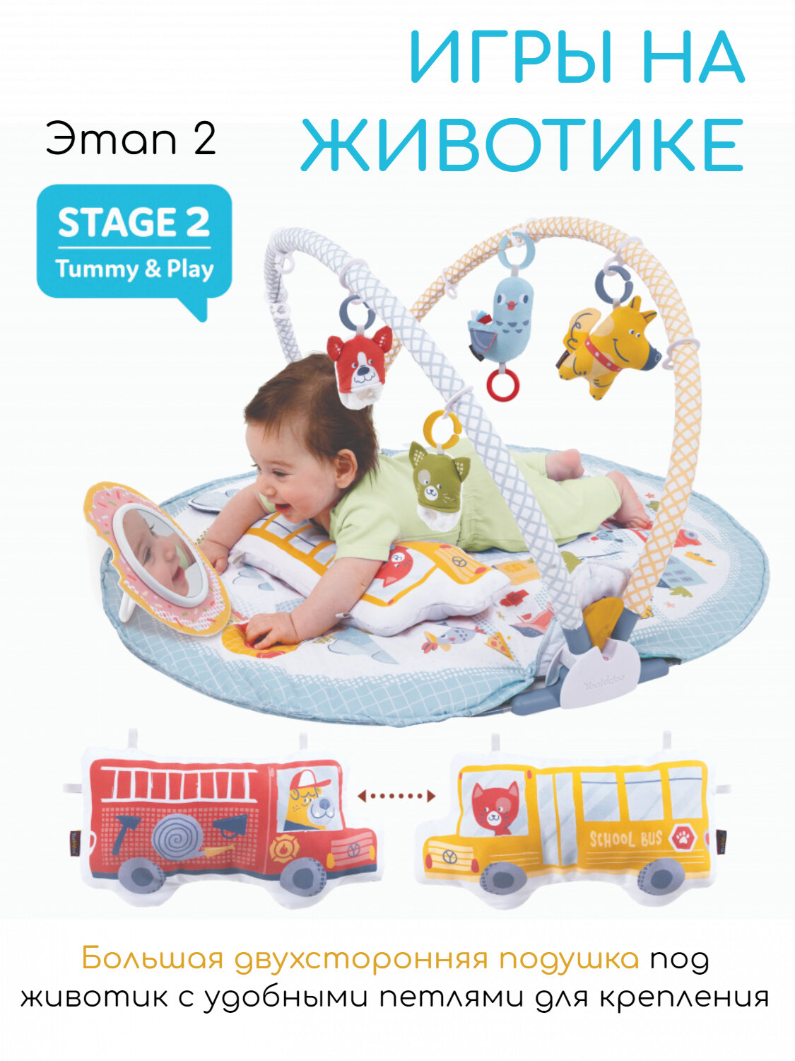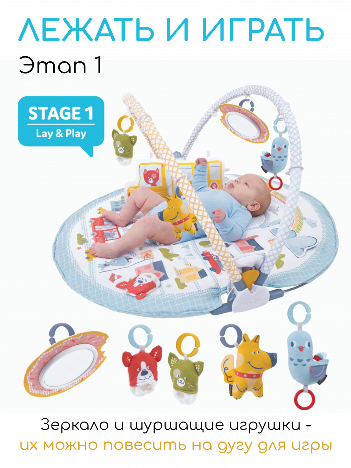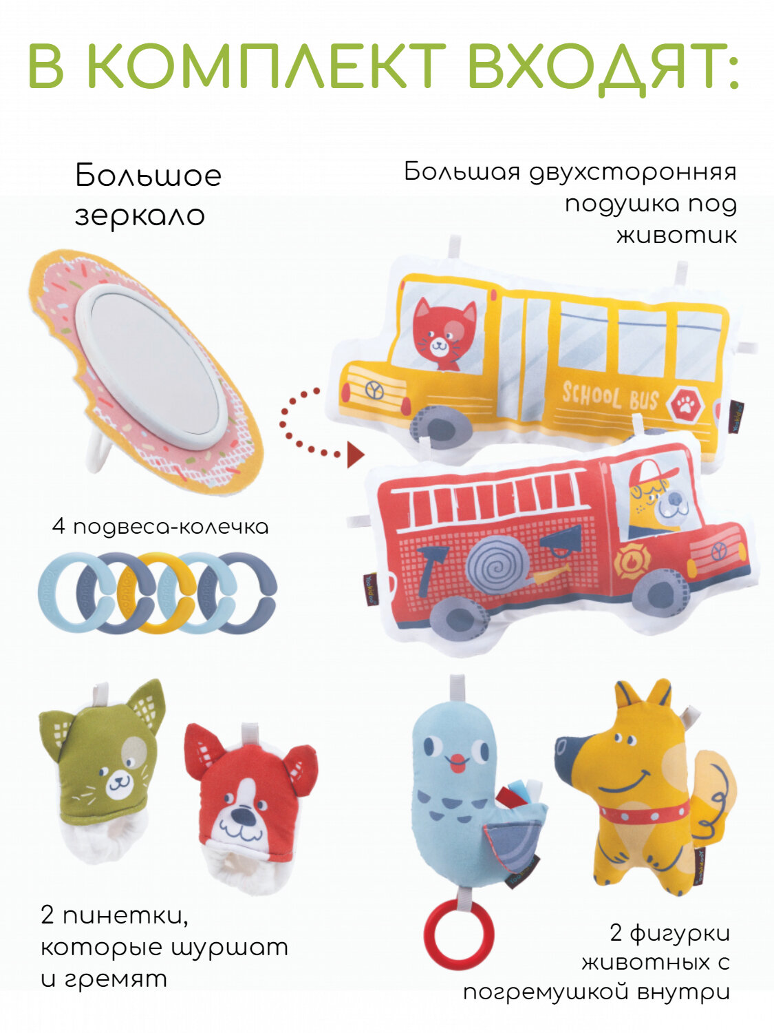 В комплекте: коврик с дугами, крепление для поддержки малыша, большая двухсторонняя подушка под животик с удобными петлями для крепления игрушек, 2 пинетки в форме животных с покрытием разной фактуры, которые шуршат и гремят (их можно носить или повесить на дугу для игры), большое безопасное детское зеркало, 2 фигурки животных с погремушкой внутри.
