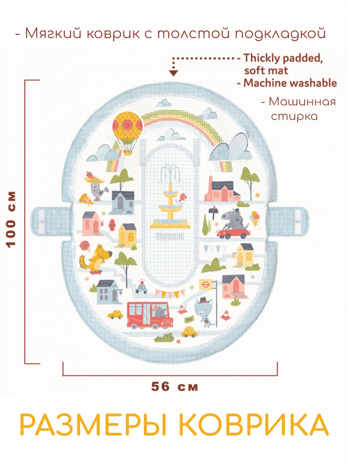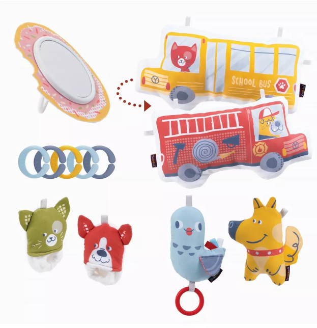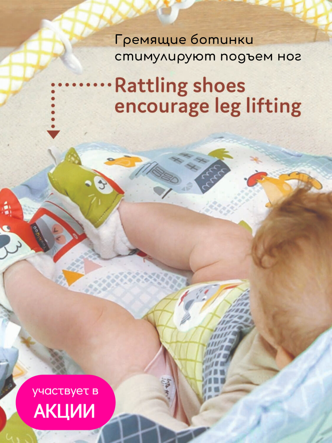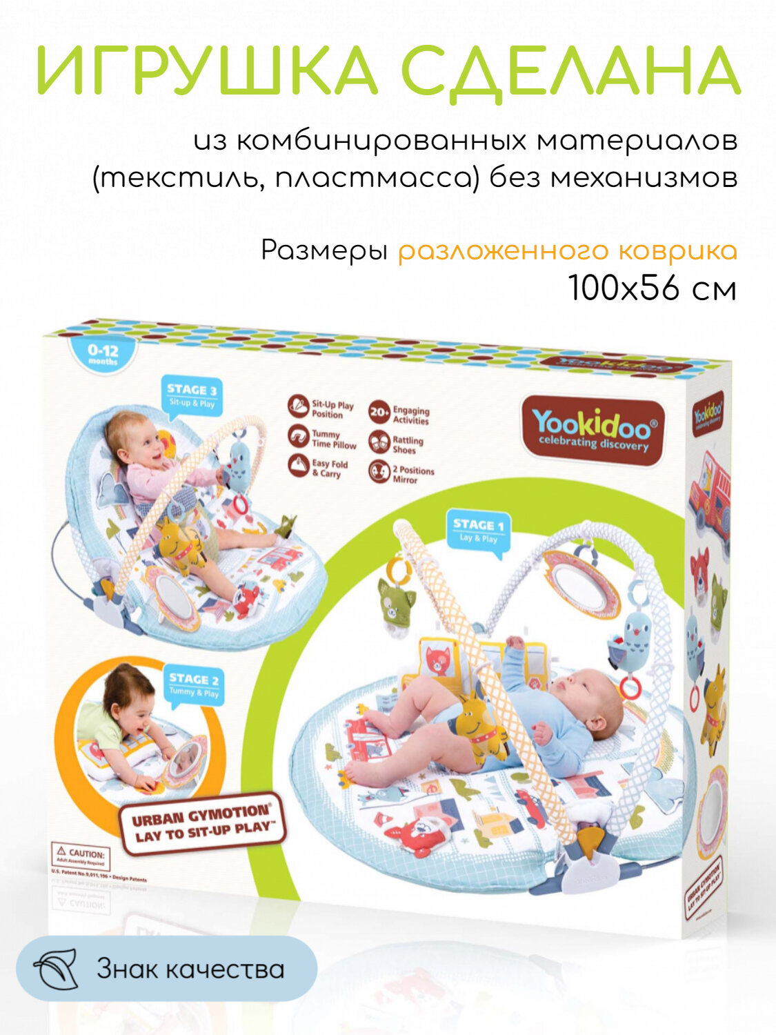 В комплекте: коврик с дугами, крепление для поддержки малыша, большая двухсторонняя подушка под животик с удобными петлями для крепления игрушек, 2 пинетки в форме животных с покрытием разной фактуры, которые шуршат и гремят (их можно носить или повесить на дугу для игры), большое безопасное детское зеркало, 2 фигурки животных с погремушкой внутри.