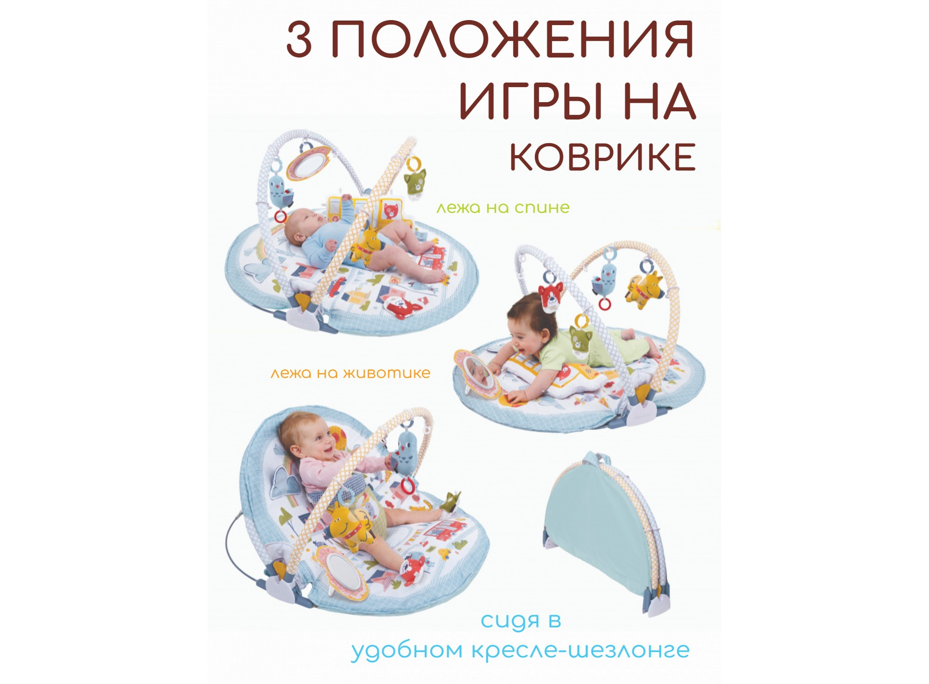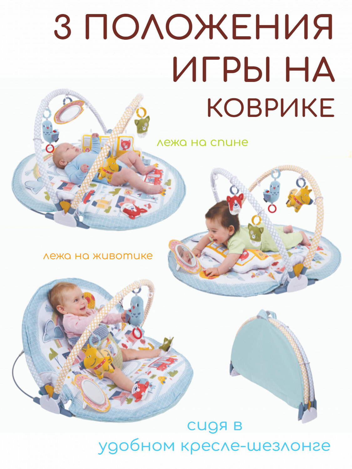 Мягкий коврик-шезлонг 3 в 1 для разных этапов развития ребенка. Легко трансформируется в детский шезлонг. Коврик позволяет малышу играть лежа на спине, животе и сидя в удобном кресле-шезлонге.