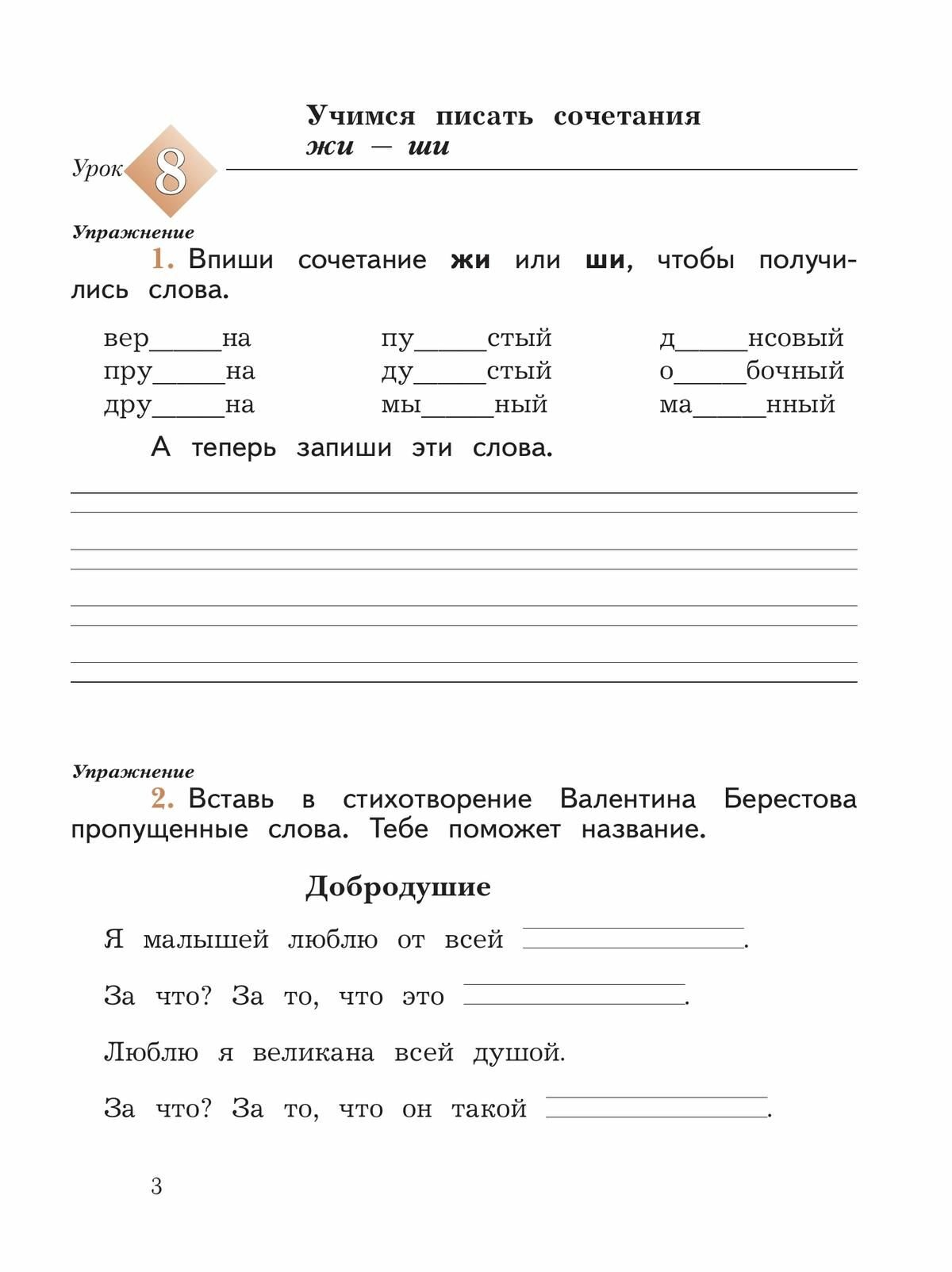 В тетради представлены разнообразные виды упражнений, которые помогают закрепить изучаемые во 2 классе правила орфографии и выработать автоматизм в их применении. Работа с тетрадью позволит поддержать стремление учащихся к овладению грамотным письмом.