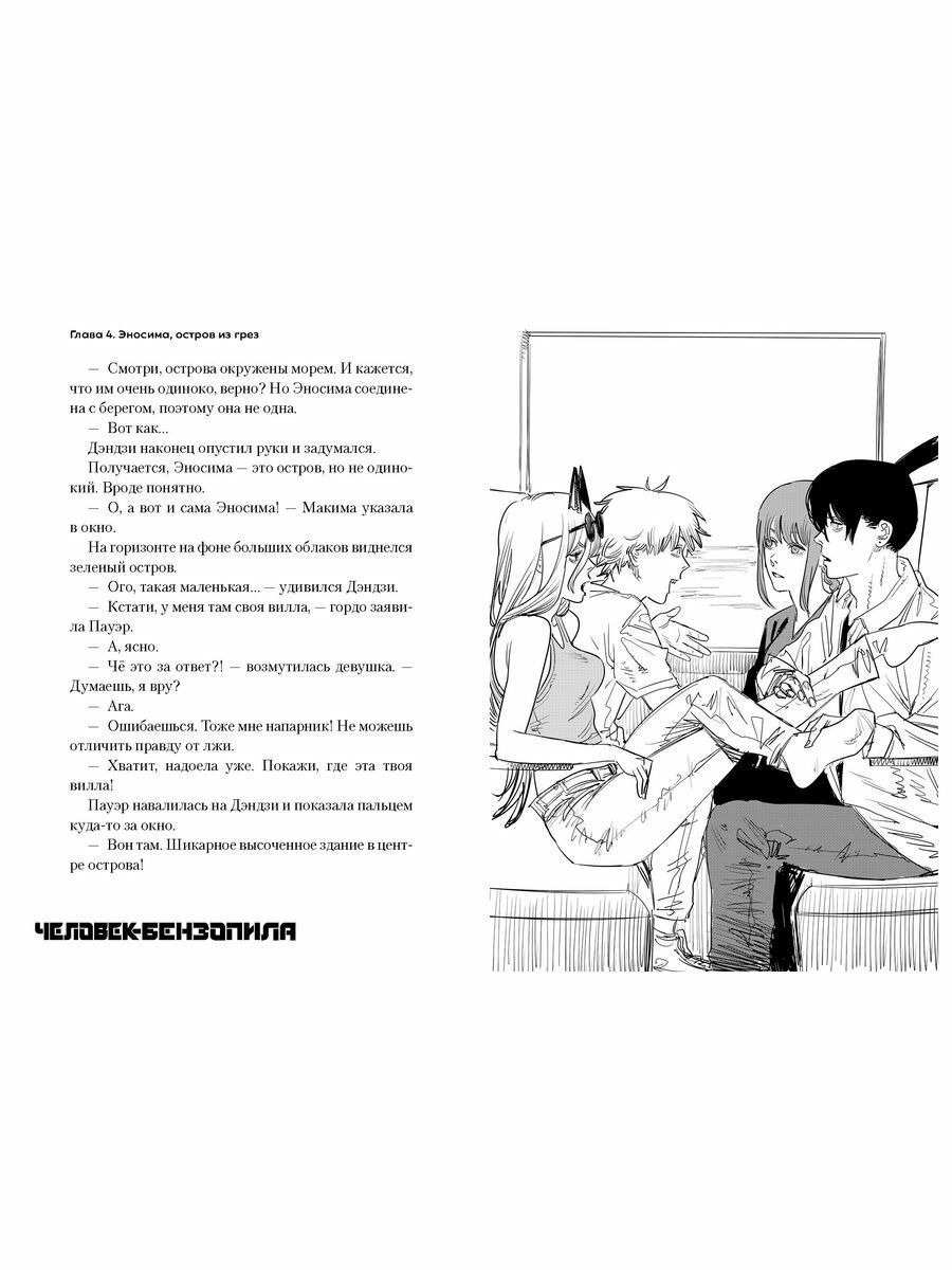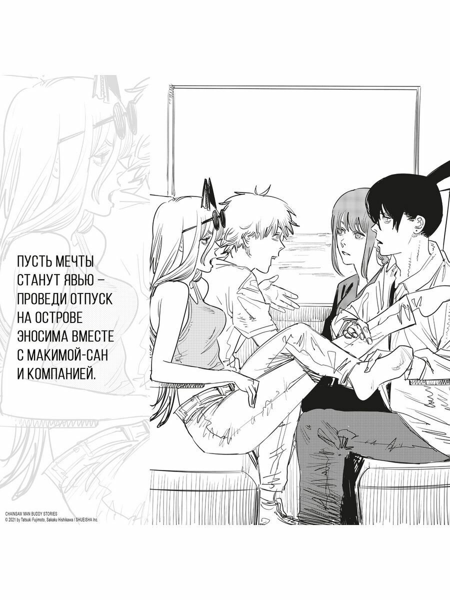 Дополнительный контент по Человеку-бензопиле лишним быть просто не может. Знакомые колоритные персонажи в 4 совершенно новых главах, с историями из их жизни, которые до этого не были нам открыты, для более глубокого раскрытия полюбившихся героев - просто сказка, а не книжка. И всё это дополняется вставками нарисованными самим Тацуки Фуджимото в его легко узнаваемом стиле. Для любителей Пилы однозначное приобретение.