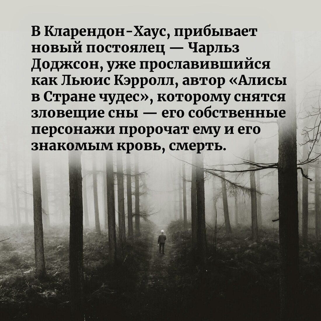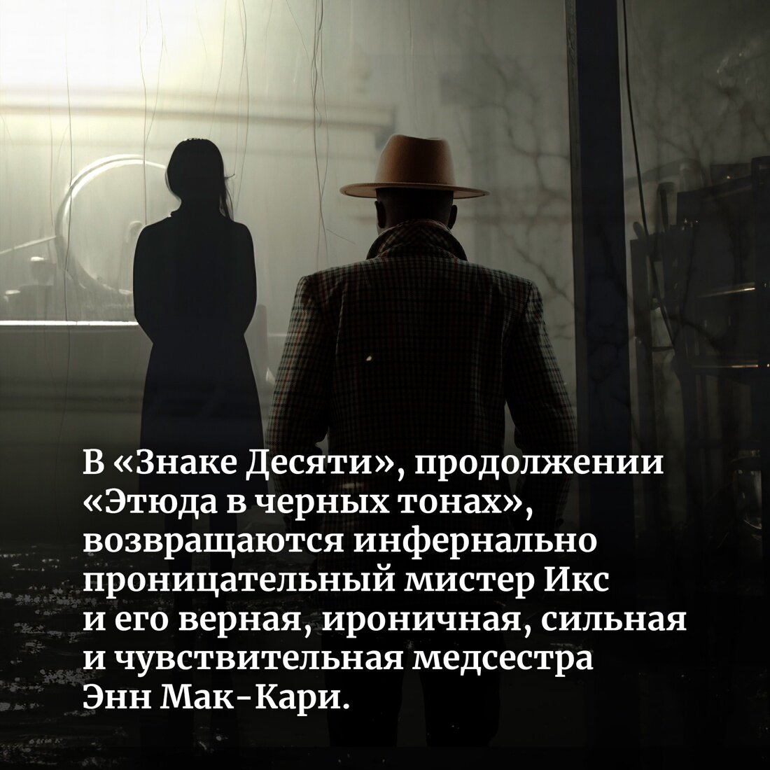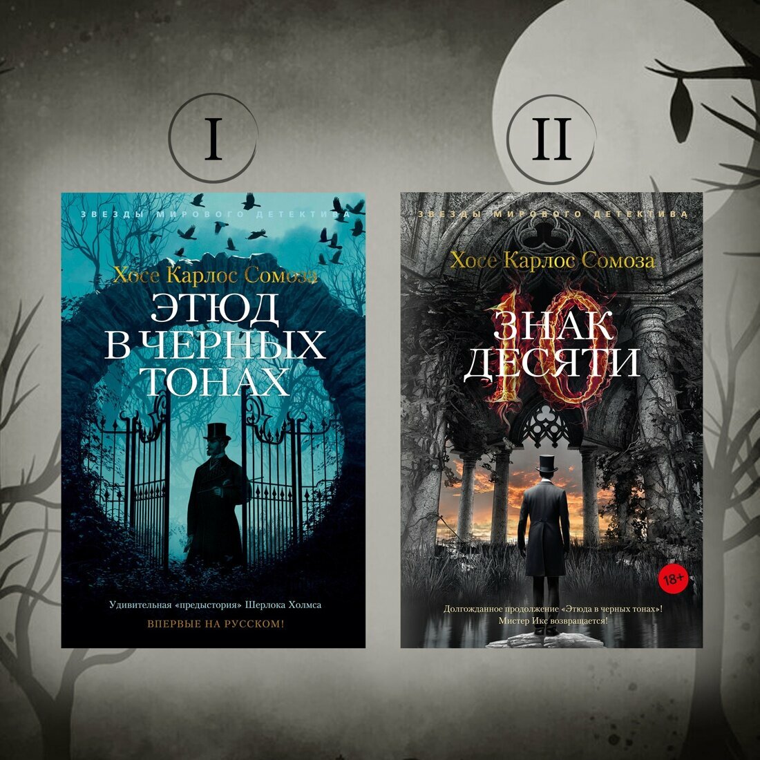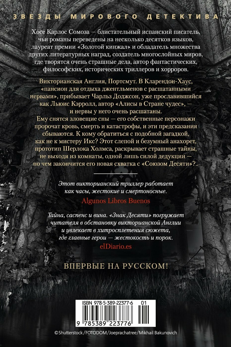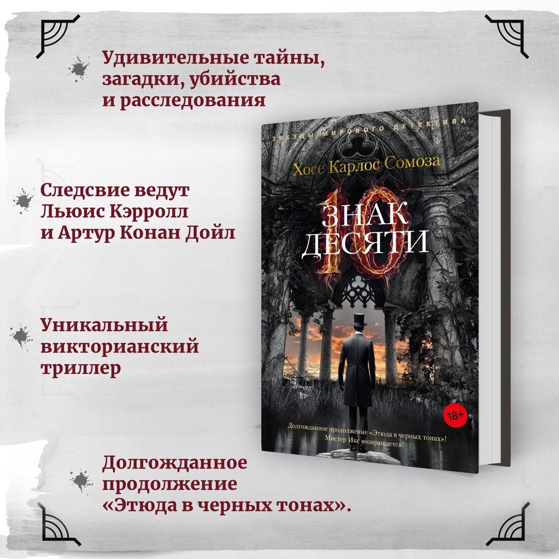 Викторианская Англия, Портсмут. В Кларендон-Хаус, «пансион для отдыха джентльменов с расшатанными нервами», прибывает новый постоялец — Чарльз Доджсон, уже прославившийся как Льюис Кэрролл, автор «Алисы в Стране чудес», — и нервы у него очень расшатаны. Чарльзу Доджсону снятся зловещие сны — его собственные персонажи пророчат ему и его знакомым кровь, смерть и катастрофы неясной природы, и эти предсказания снова и снова сбываются. К кому обратиться с подобной загадкой, как не к мистеру Икс, которому внятна подоплека любых человеческих поступков? Этот слепой и безумный анахорет, певец рациональности, прототип Шерлока Холмса, раскрывает страшные тайны, не выходя из комнаты, одной лишь силой дедукции — но чем закончится его новая схватка с «Союзом Десяти»? Хосе Карлос Сомоза — блистательный испанский писатель, чьи романы переведены на несколько десятков языков, лауреат премии «Золотой кинжал» и обладатель множества других литературных наград, создатель многослойных миров, где творятся очень страшные дела, автор фантастических, философских, исторических триллеров и хорроров. В «Знаке Десяти», продолжении «Этюда в черных тонах», возвращаются инфернально проницательный мистер Икс и его верная, ироничная, сильная и чувствительная медсестра Энн Мак-Кари, а вместе с ними в непредсказуемой интриге замешаны актеры, бутафоры и зрители жестоких подпольных театров, известные психиатры и, разумеется, Артур Конан Дойл. Впервые на русском!