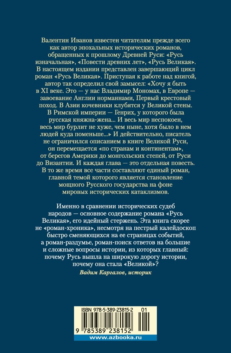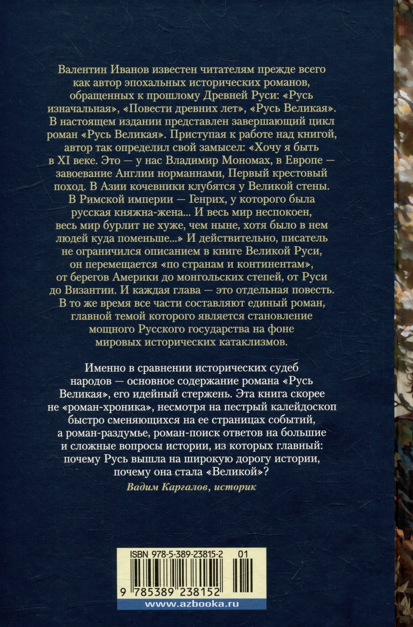 Валентин Иванов известен читателям прежде всего как автор эпохальных исторических романов, обращенных к прошлому Древней Руси: «Русь изначальная», «Повести древних лет», «Русь Великая». В настоящем издании представлен завершающий цикл роман «Русь Великая». Приступая к работе над книгой, автор так определил свой замысел: «Хочу я быть в XI веке. Это — у нас Владимир Мономах, в Европе — завоевание Англии норманнами, Первый крестовый поход. В Азии кочевники клубятся у Великой стены. В Римской империи — Генрих, у которого была русская княжна-жена... И весь мир неспокоен, весь мир бурлит не хуже, чем ныне, хотя было в нем людей куда поменьше…» И действительно, писатель не ограничился описанием в книге Великой Руси, он перемещается «по странам и континентам через XI век», от берегов Америки до монгольских степей, от Руси до Византии. И каждая глава — это отдельная повесть. В то же время все части составляют единый роман, главной темой которого является становление мощного Русского государства на фоне мировых исторических катаклизмов.
