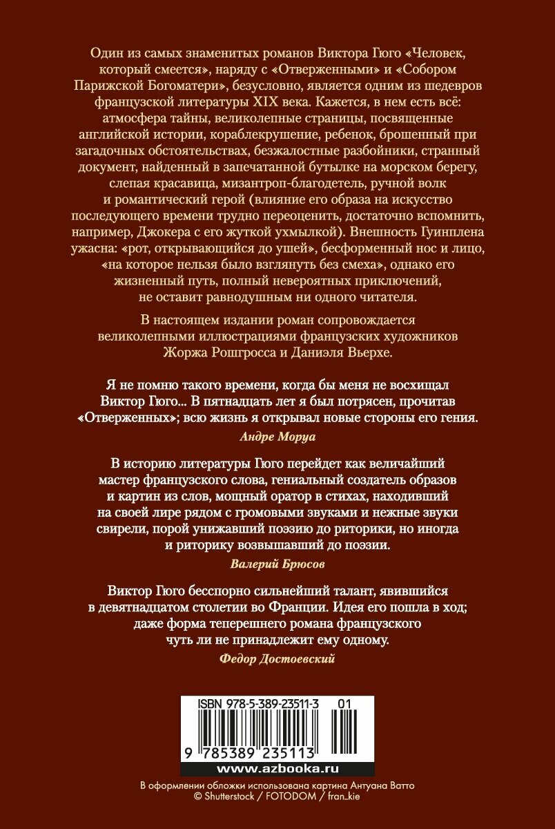 Один из самых знаменитых романов Виктора Гюго «Человек, который смеется», наряду с «Отверженными» и «Собором Парижской Богоматери», безусловно, является одним из шедевров французской литературы XIX века. Кажется, в нем есть все: атмосфера тайны, великолепные страницы, посвященные английской истории, кораблекрушение, ребенок, брошенный при загадочных обстоятельствах, безжалостные разбойники, странный документ, найденный в запечатанной бутылке на морском берегу, слепая красавица, мизантроп-благодетель, ручной волк и романтический герой (влияние его образа на искусство последующего времени трудно переоценить, достаточно вспомнить, например, Джокера с его жуткой ухмылкой). Внешность Гуинплена ужасна: «рот, открывающийся до ушей», бесформенный нос и лицо, «на которое нельзя было взглянуть без смеха», однако его жизненный путь, полный невероятных приключений, не оставит равнодушным ни одного читателя. В настоящем издании роман сопровождается великолепными иллюстрациями французских художников Жоржа Рошгросса и Даниэля Вьерхе.