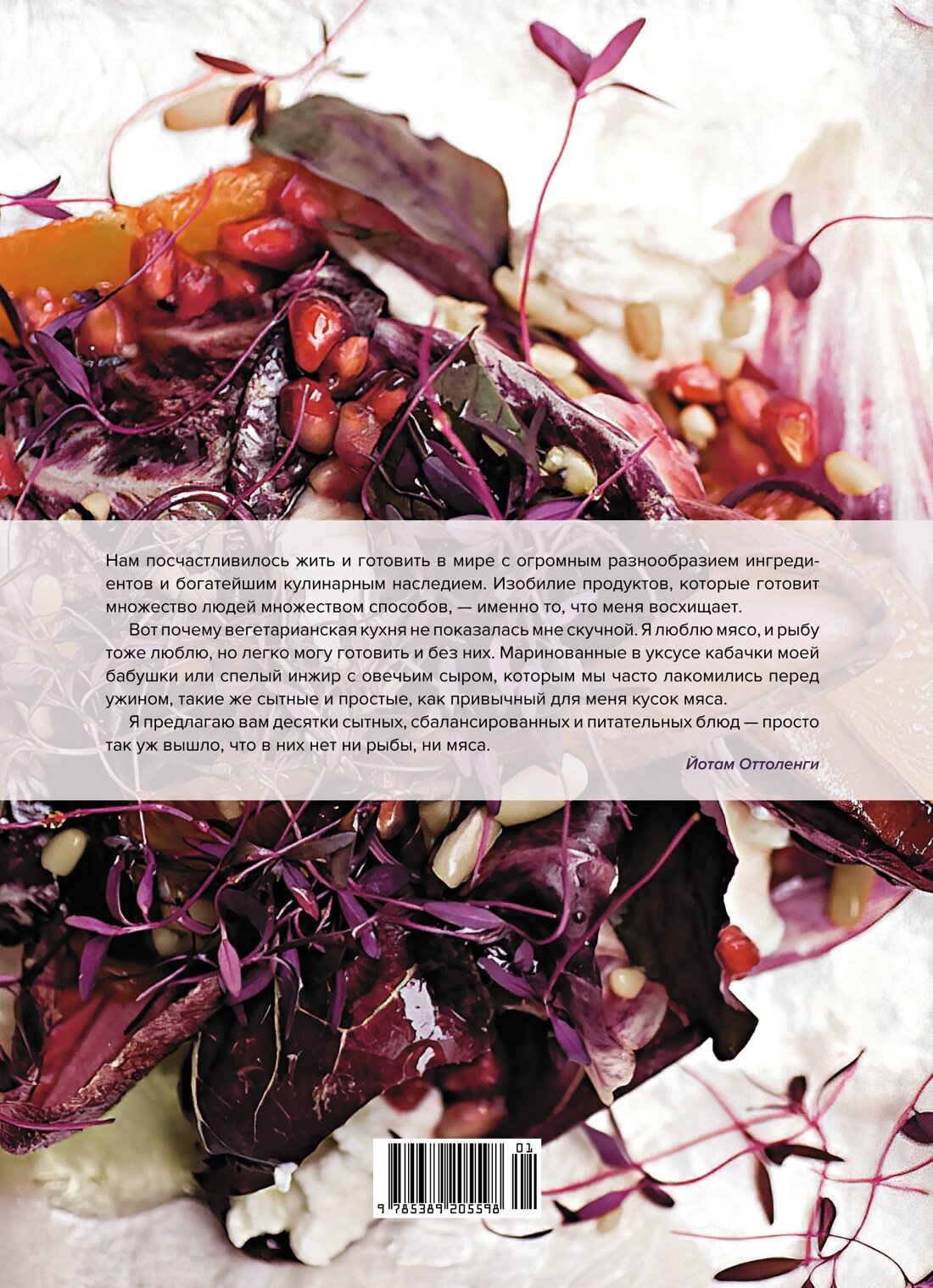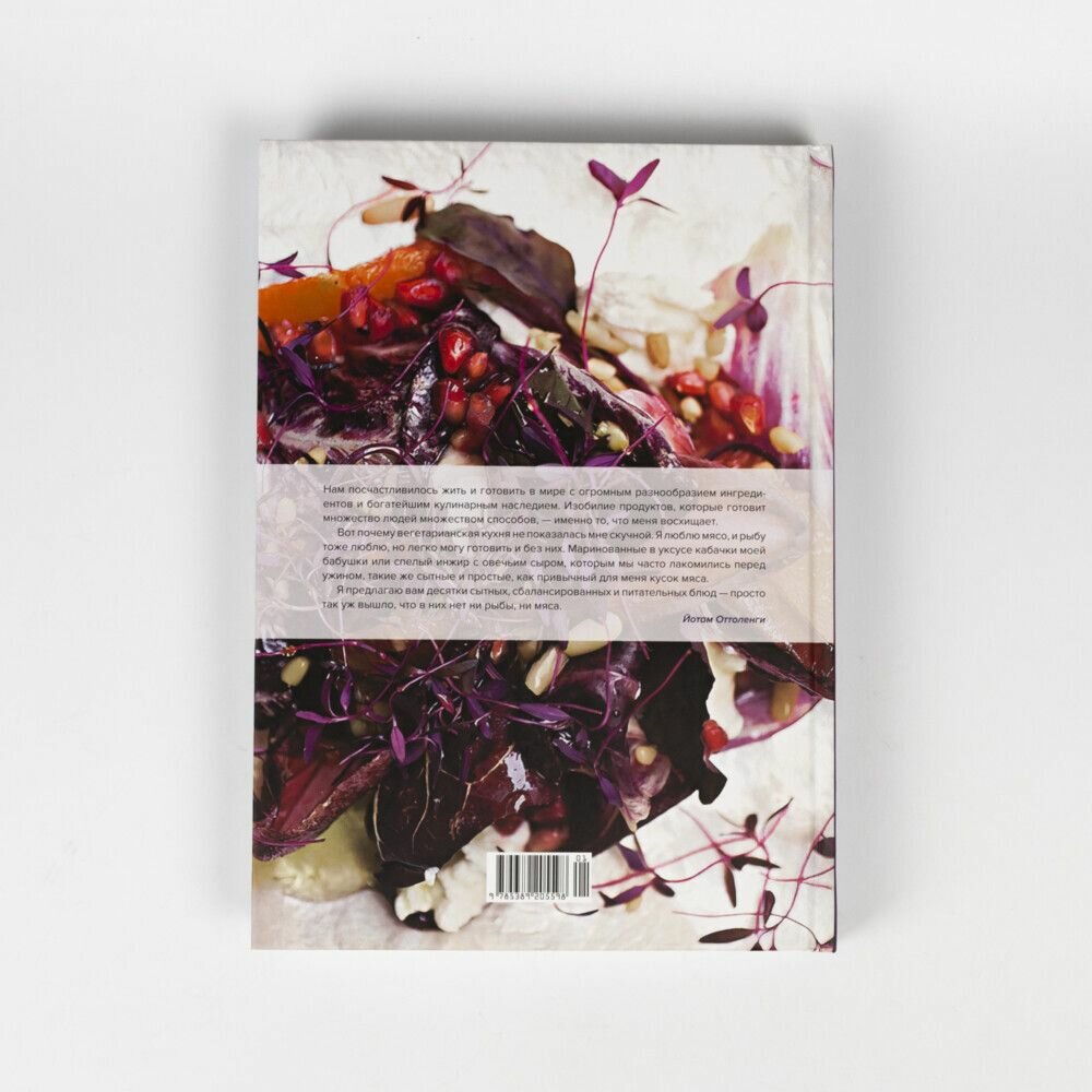 Эта книга — итог моей четырехлетней работы в The Guardian Weekend, где я вел колонку для вегетарианцев. Читатели, которым надоело коллекционировать журнальные вырезки, часто просили меня собрать все под одной обложкой. В основу этого сборника вошли рецепты, которые ранее публиковались в The New Vegetarian, к ним я добавил немало новых. Кому-то может не понравиться, что я активно использую яйца и молочные продукты. Кого-то, вероятно, отпугнет, что я ратую за пармезан и другие континентальные сыры, при производстве которых почти всегда используется сычужный фермент. Но я такой, какой есть, и готовлю то, что мне по вкусу».?(Йотам Оттоленги)
