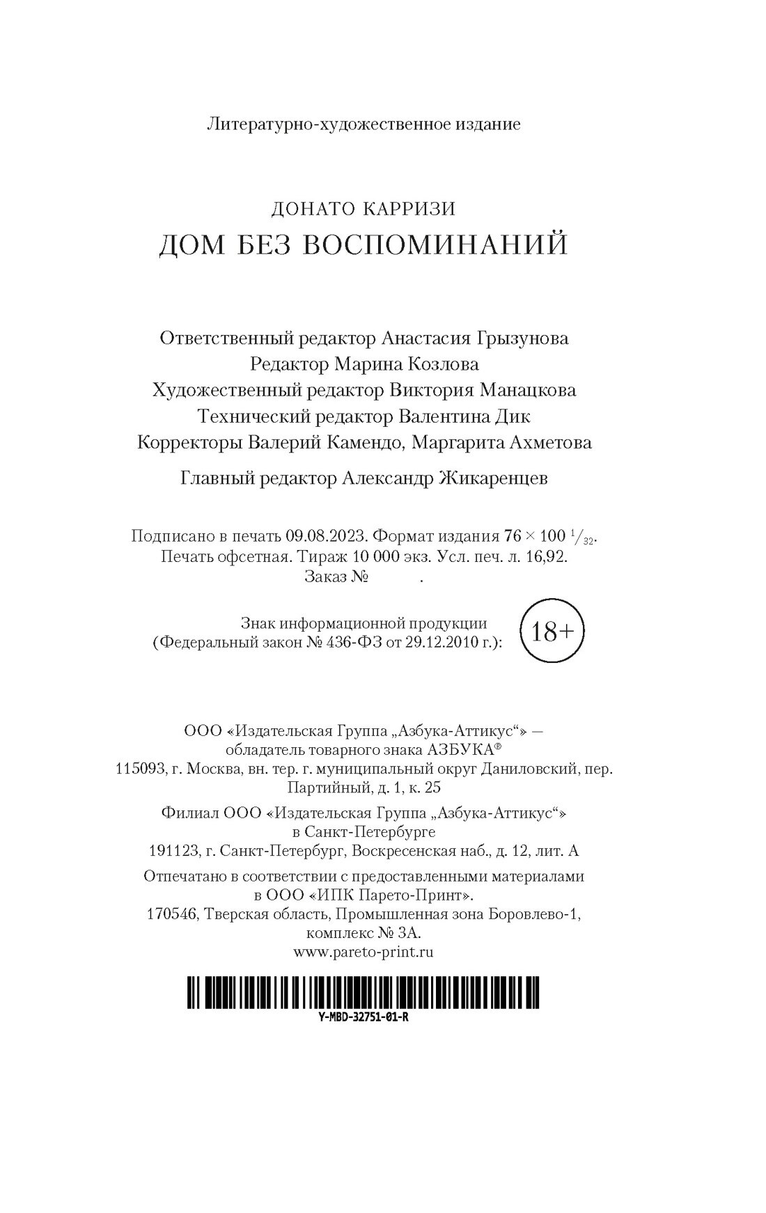 Книга: Дом без воспоминаний (Карризи Донато); Азбука, 2025
