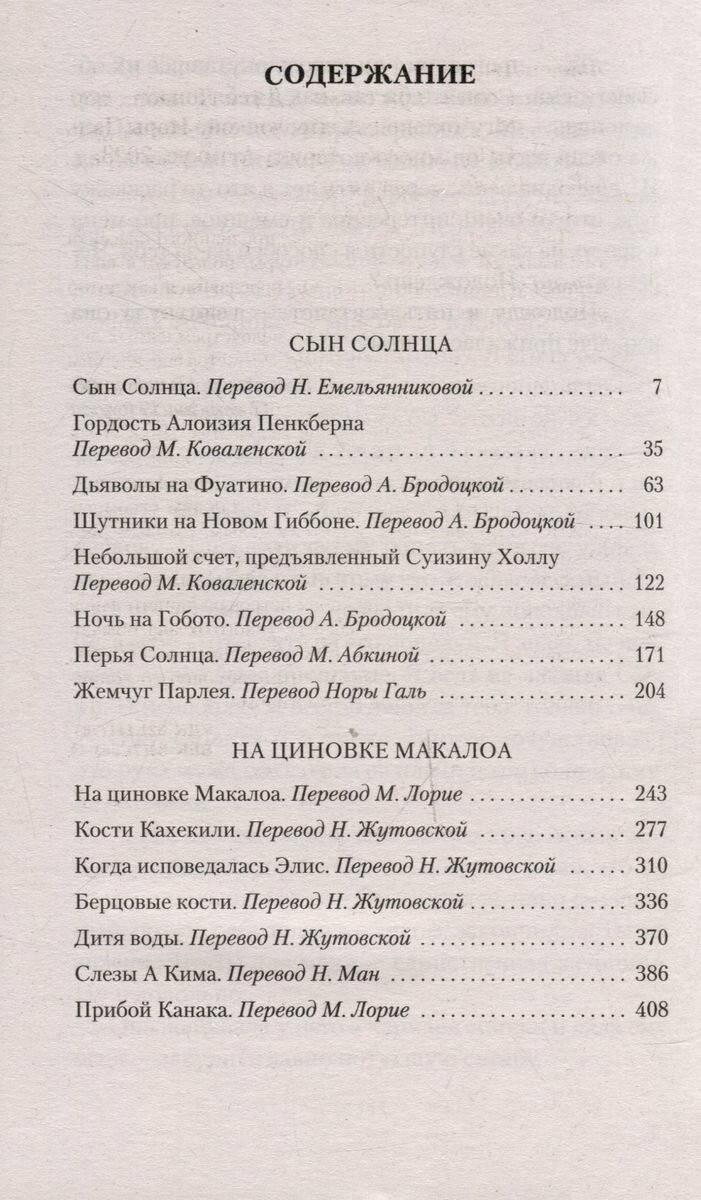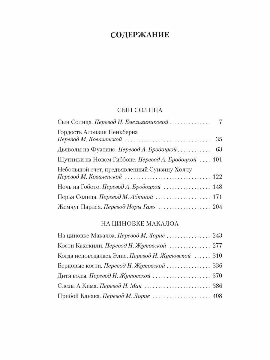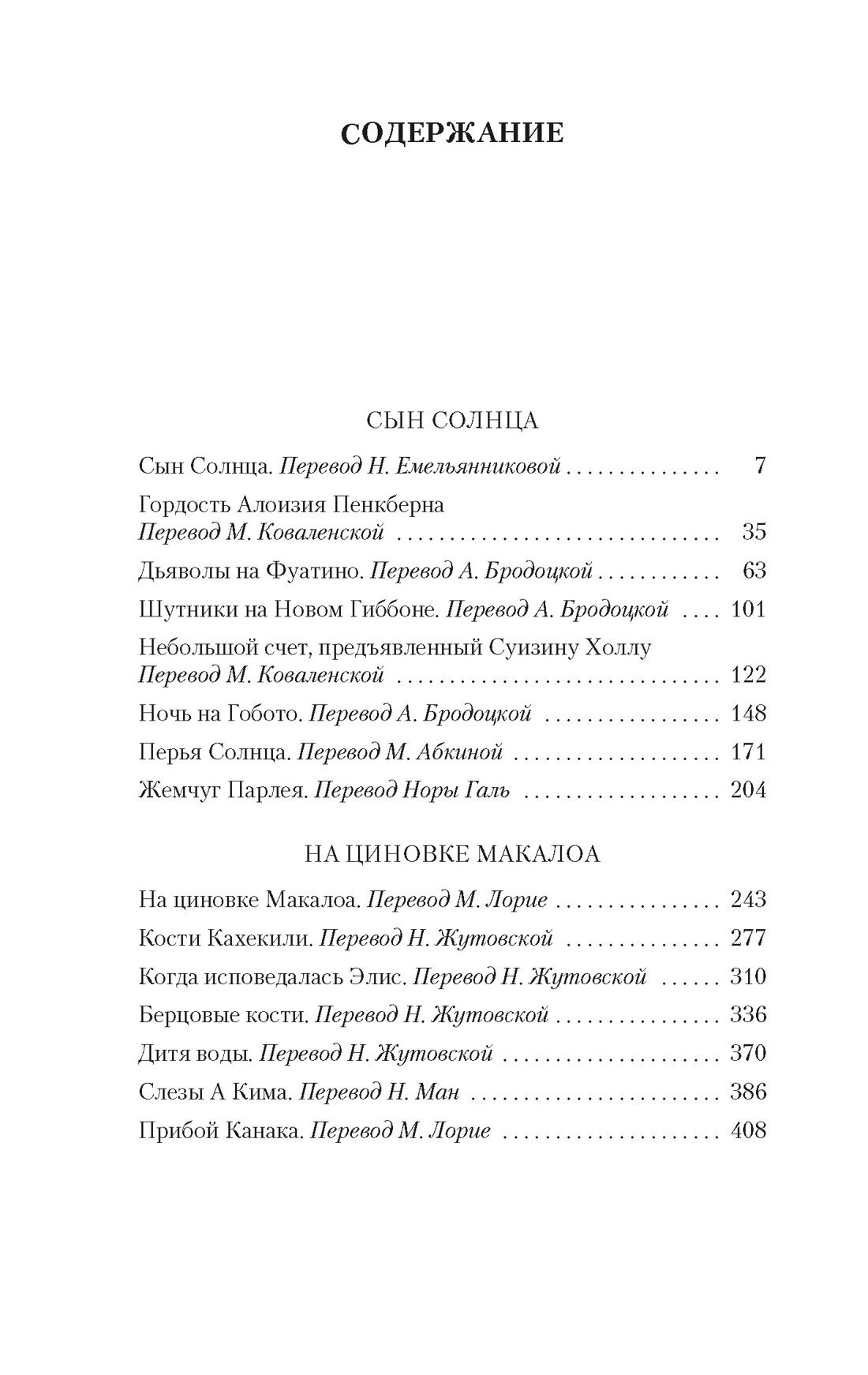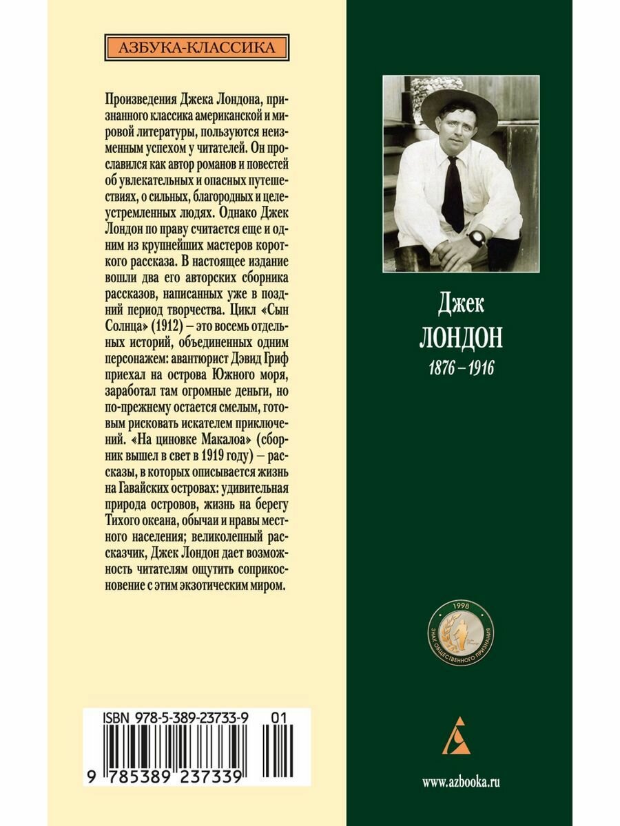 Произведения Джека Лондона, признанного классика американской и мировой литературы, пользуются неизменным успехом у читателей. Он прославился как автор романов и повестей об увлекательных и опасных путешествиях, о сильных, благородных и целеустремленных людях. Однако Джек Лондон по праву считается еще и одним из крупнейших мастеров короткого рассказа. В настоящее издание вошли два его авторских сборника рассказов, написанных уже в поздний период творчества. Цикл «Сын Солнца» (1912) — это восемь отдельных историй, объединенных одним персонажем: авантюрист Дэвид Гриф приехал на острова Южного моря, заработал там огромные деньги, но по-прежнему остается смелым, готовым рисковать искателем приключений. «На циновке Макалоа» (сборник вышел в свет в 1919 году) — рассказы, в которых описывается жизнь на Гавайских островах: удивительная природа островов, жизнь на берегу Тихого океана, обычаи и нравы местного населения;