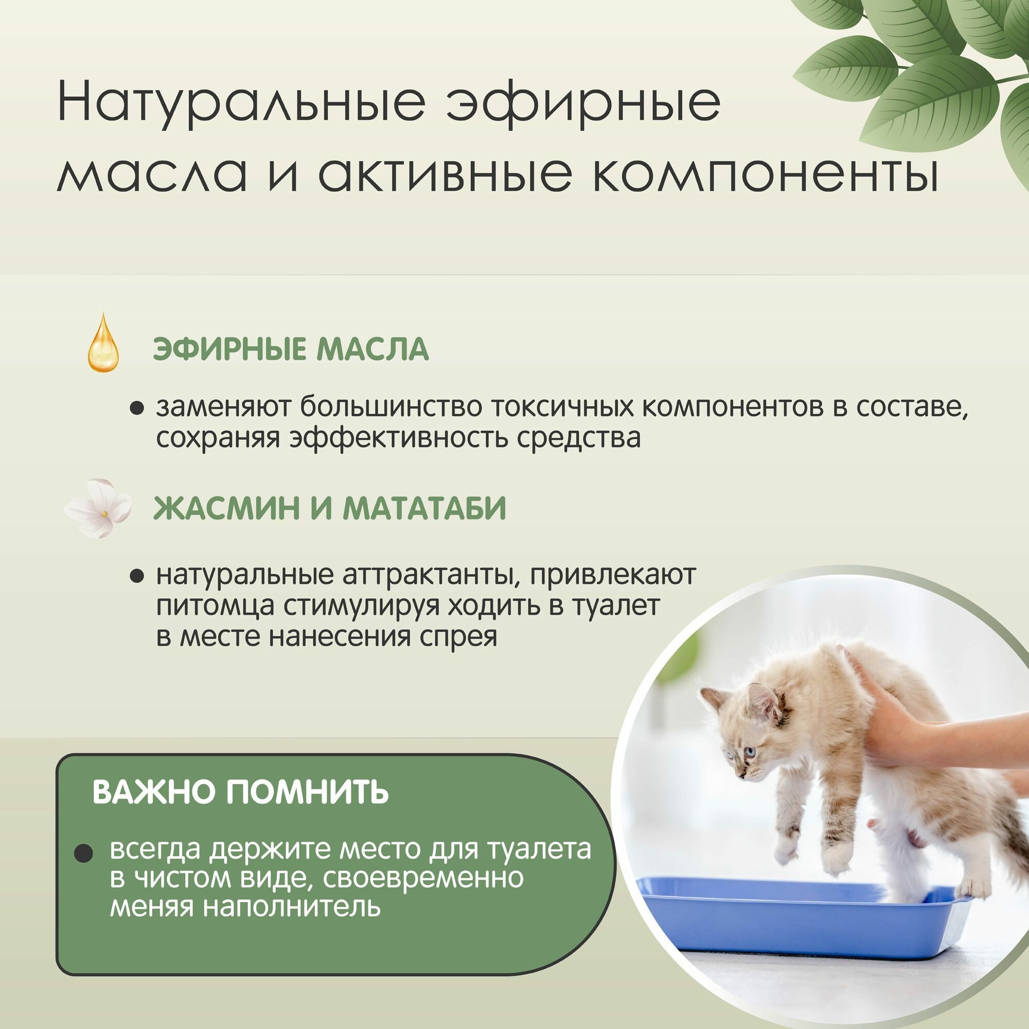 Спрей Tamachi (Тамачи) Potty Training spray for cats Jasmine & Matatabi Для приучения к туалету кошек, с ароматом жасмина и мататаби, 200 мл. Прогрессивный хозяин задумывается, как приучить своего питомца к туалету без лишнего стресса как для себя, так и для животного. Специально разработанные средства Tamachi для приучения к туалету содержат натуральные аттрактанты, благодаря которым питомец понимает, что обработанное место подходит для туалета. Tamachi Potty Training spray for cats cокращает время приучения кошки к лотку, стимулируя животное ходить в туалет в месте нанесения спрея. Активные вещества в составе спрея работают на молекулярном уровне: • особое сочетание компонентов на основе натуральных масел позволяет выработать стойкую привычку ходить в туалет в специально отведенном для этого месте • помогают сохранить чистоту в доме без применения силы или иного воздействия • подходит как для малышей, так и для взрослых животных. Используйте Tamachi Potty Training spray for cats для приучения к туалету кошек для: • приучения котят и кошек к лотку • профилактики проблем при переезде в новый дом или смене лотка • сохранения чистоты в доме. Внимание! Всегда держите место для туалета в чистом виде, своевременно меняя наполнитель. В процессе приучения ни в коем случае не стоит подвергать питомца физическому насилию, если он сходил в неправильное место для туалета. Способ применения: Встряхните флакон и распылите средство на кусочек бумаги. Положите бумагу на место, которое вы определили в качестве туалета, и привлеките внимание питомца. Лучше это сделать после пробуждения или приема пищи животными. Следует менять бумагу после каждого туалета питомца. Процедуру следует повторять в течение 10–14 дней до появления у питомца стойкой привычки ходить в это место. СОСТАВ: вода питьевая, спирт изопропиловый, Твин-80, эфирное масло жасмина, эфирное масло мататаби.