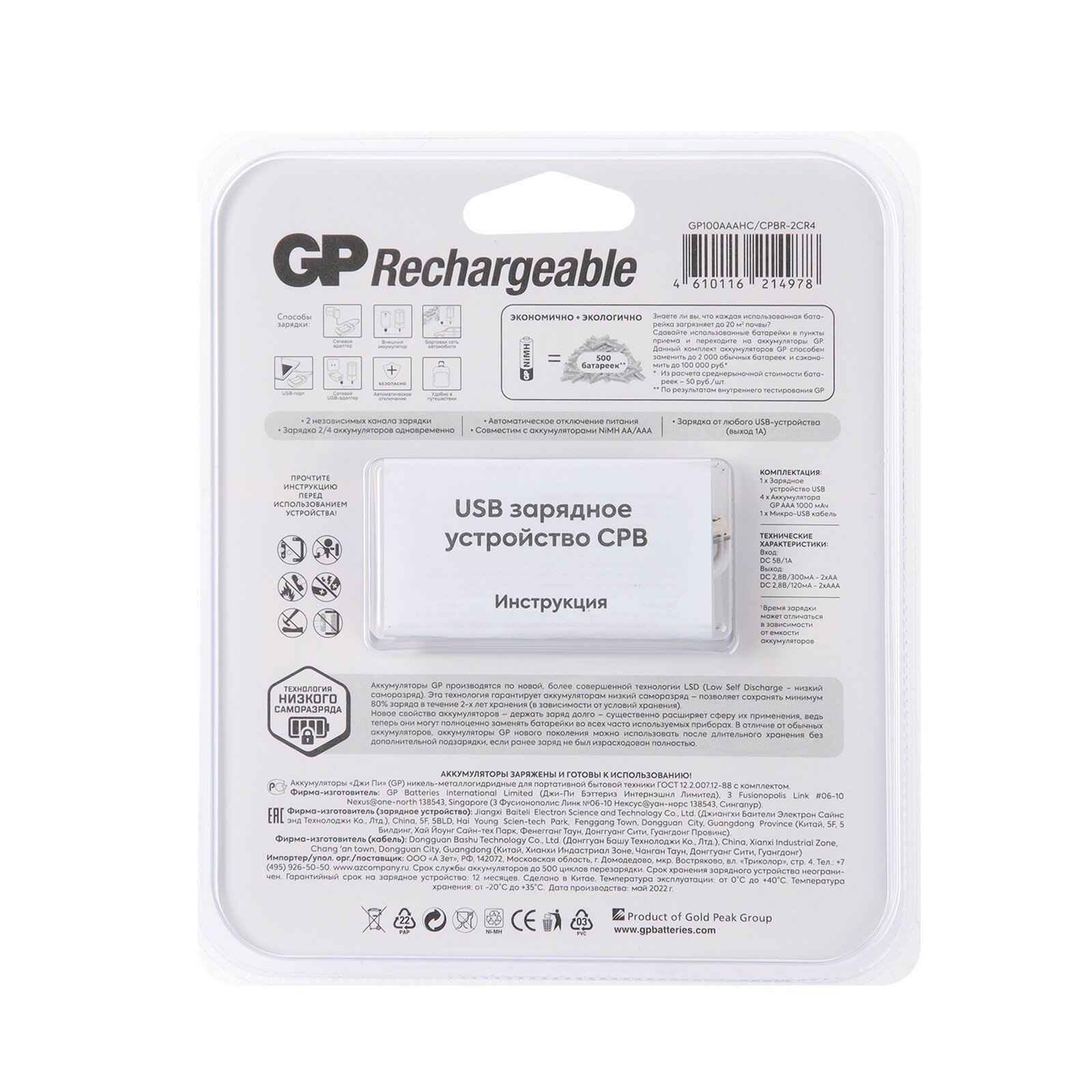 Зарядное устройство GP , NiMH 1000мAч, типоразмер AA/AAA, в упаковке 4шт (GP Е411/100AAAHCCS-2CR1)