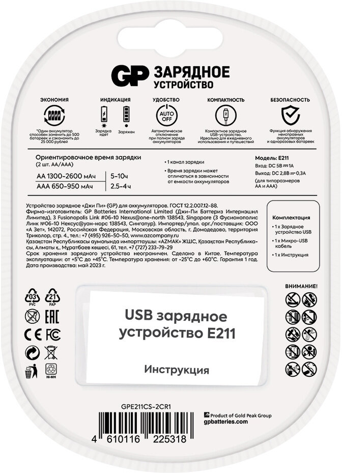 Зарядное устройство GP Е211CS-2CR1, NiMH, типоразмер AA/AAA (GP Е211CS-2CR1)