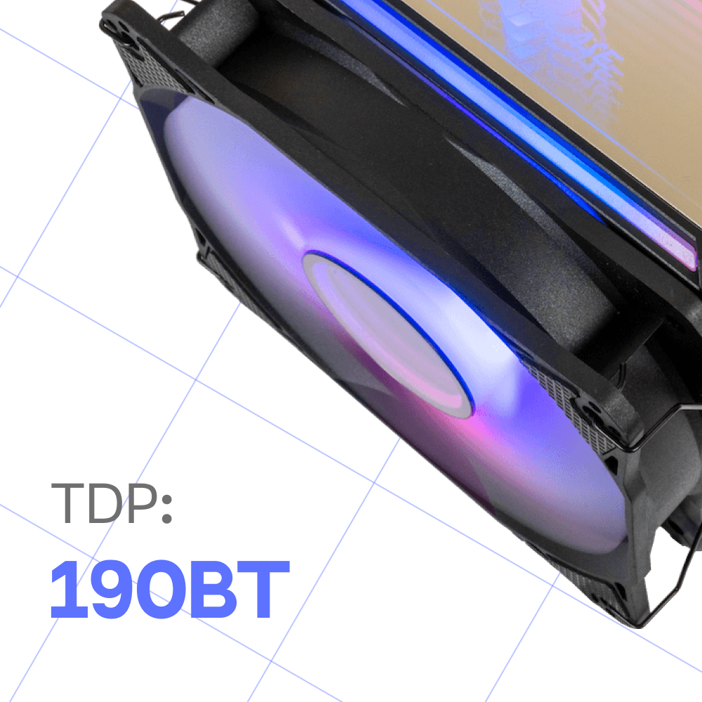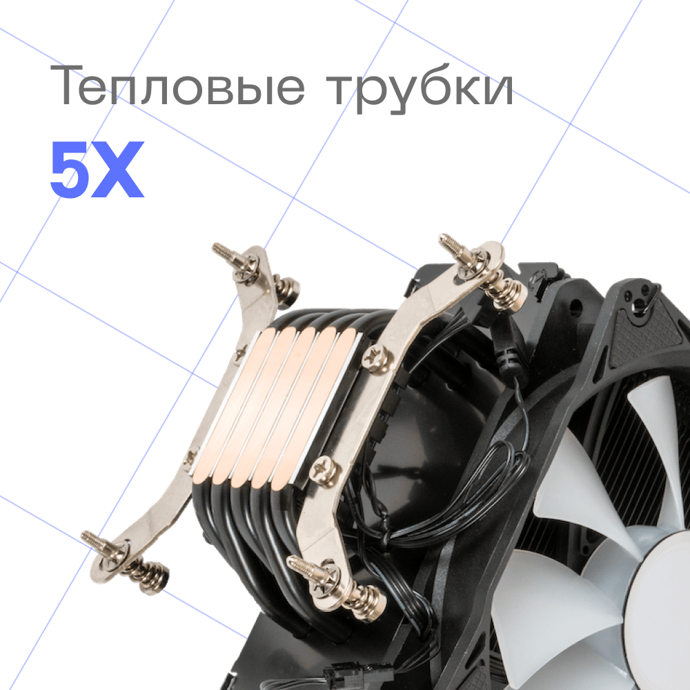 Кулер оснащен 5 медными тепловыми трубками, которые эффективно отводят тепло от процессора. Материал радиатора – алюминий, что обеспечивает высокую теплопроводность и долговечность.