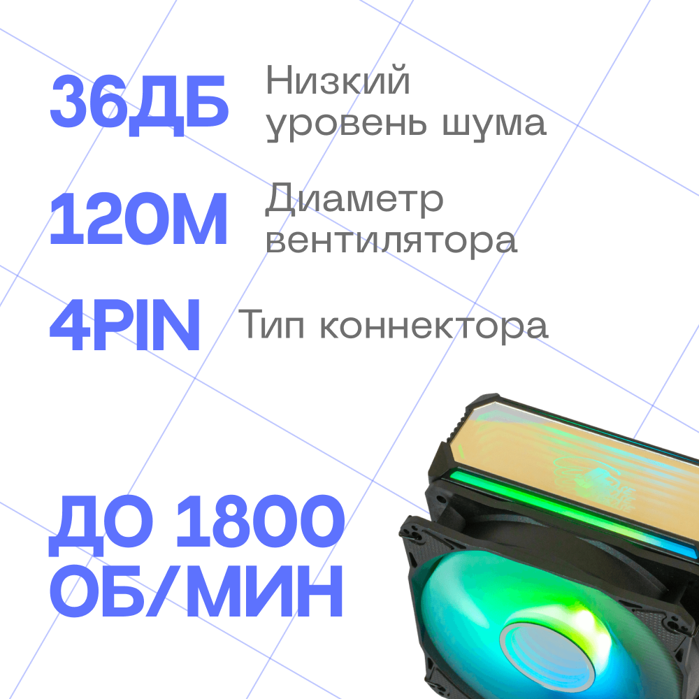 Вентилятор кулера имеет диаметр 120 мм и работает на скорости от 800 до 1800 оборотов в минуту, обеспечивая максимальный воздушный поток 79.02 CFM и уровень шума всего 36 дБ. Это позволяет регулировать скорость вращения вентилятора в зависимости от нагрузки на процессор и уровня шума.