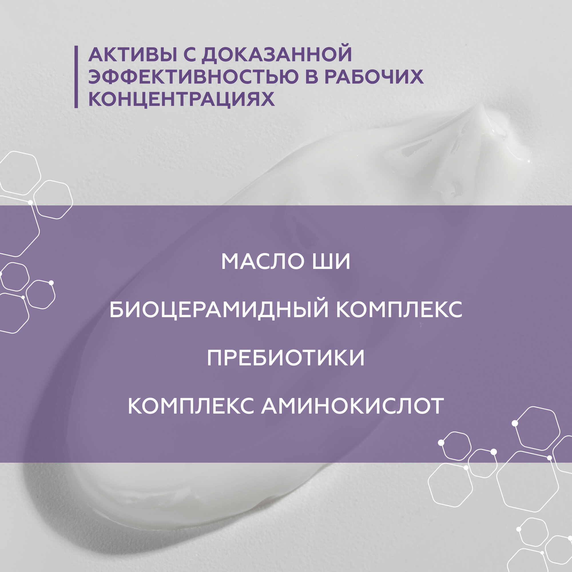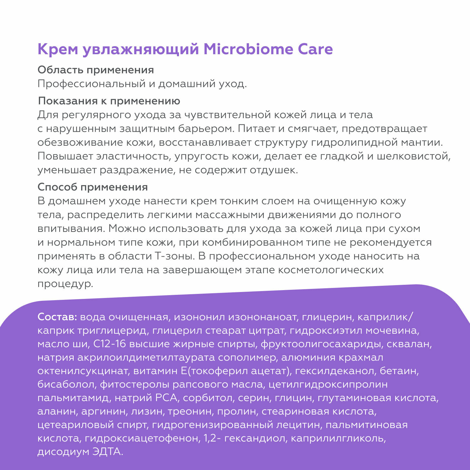 Крем питает, увлажняет и смягчает кожу, препятствует потере влаги, снимает покраснение и раздражение. Комплексы аминокислот и биоцерамидов восстанавливают роговой слой кожи и гидролипидную мантию. Пребиотики в составе поддерживают здоровый микробиом кожи. Ламеллярная эмульсия быстро впитывается, не оставляя на коже липких следов. Без красителей и отдушек.