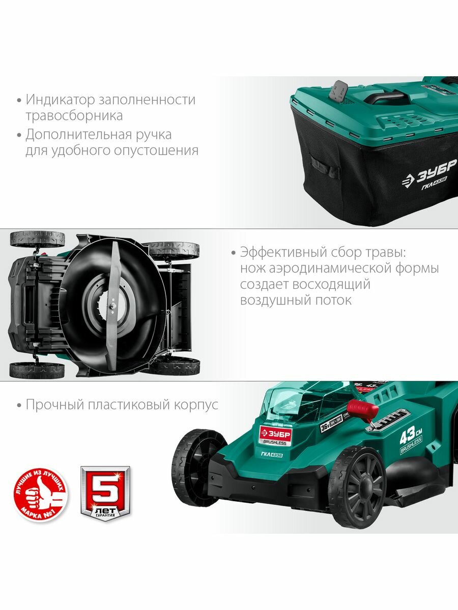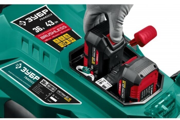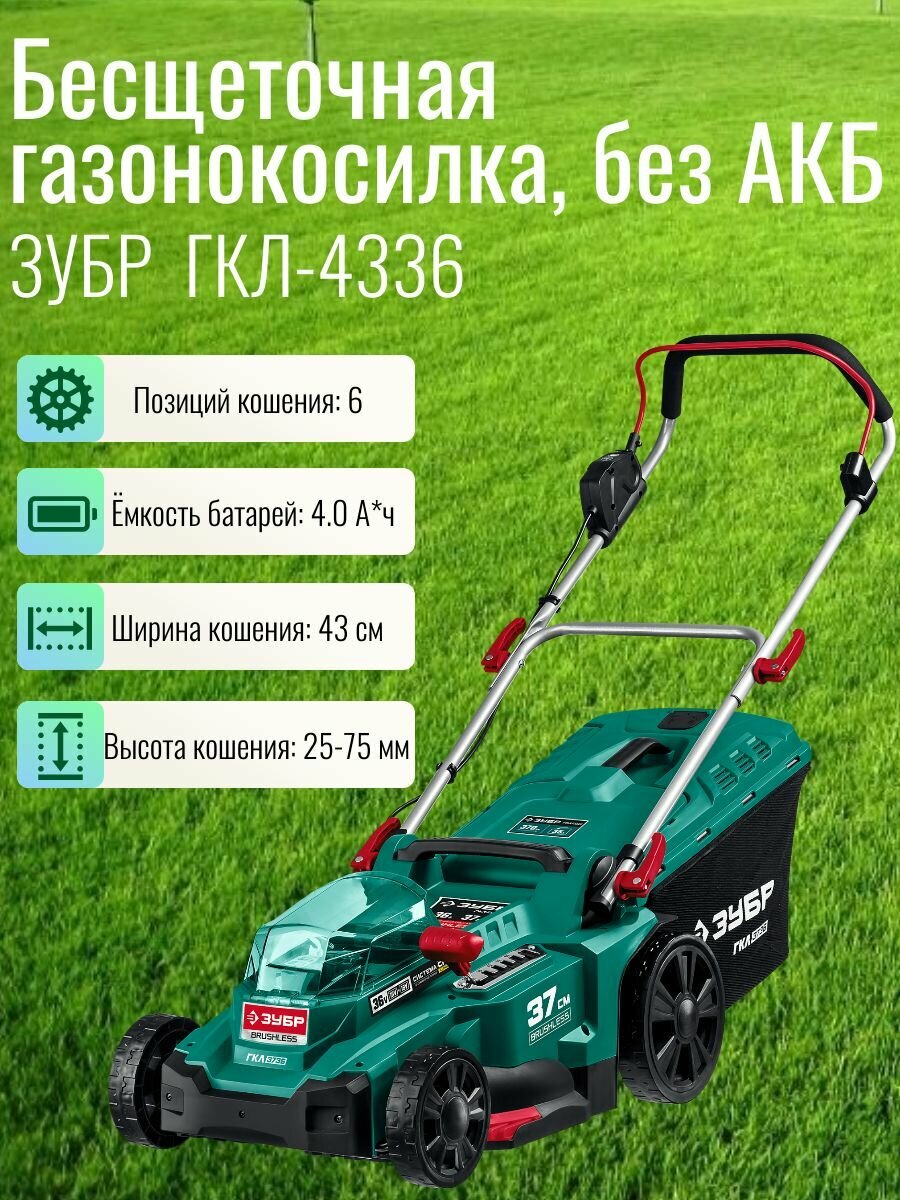 Газонокосилка аккумуляторная Зубр ГКЛ-4336, нож, ширина скашивания 43см, тип выброса травы: в травосборник, четырехколесная