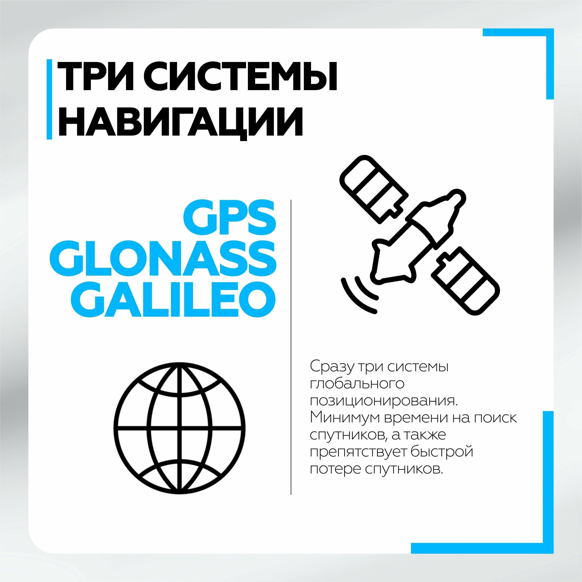 В магнитное крепление впервые встроено сразу три системы глобального позиционирования: GPS + GLONASS + GALILEO, что позволяет сократить до минимума время на поиск спутников, а также препятствует быстрой потере спутников при въезде в туннель или зону плотной застройки.