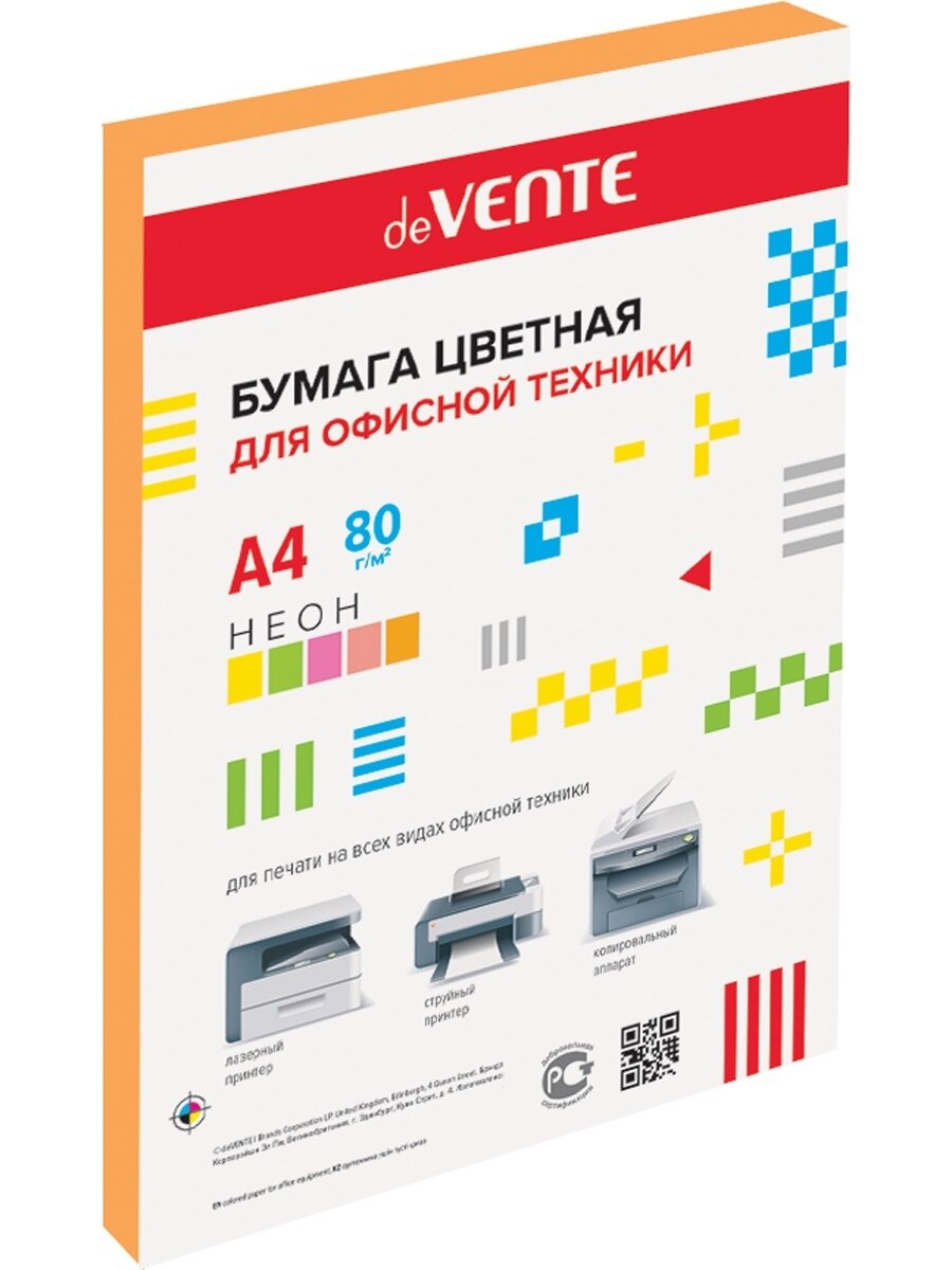 Бумага цветная для принтера неоново-оранжевая A4 100 листов deVENTE