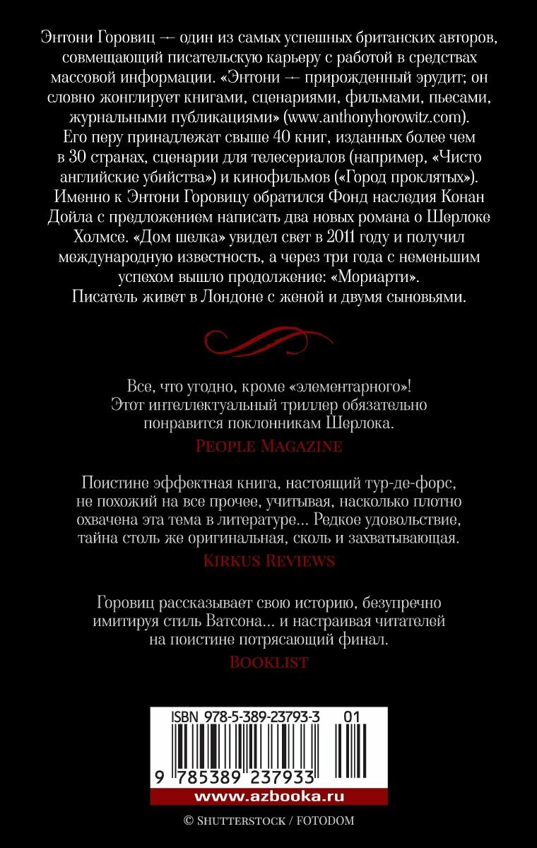 В литературном и кинематографическом мире нет более популярного героя, чем Шерлок Холмс. Это имя стало сенсацией в 1890-х благодаря публикациям в журнале «Стрэнд», тиражи которого сразу выросли на треть. По числу экранизаций история о детективе с Бейкер-стрит попала в Книгу рекордов Гиннесса. О количестве литературных пастишей и говорить нечего, но официальное одобрение Фонда наследия Конан Дойла получил только Энтони Горовиц за свой роман «Дом шелка». И спустя три года после выхода этой книги Энтони Горовиц вернулся в мир великого сыщика. После того как профессор Мориарти исчез в бурных водах Рейхенбахского водопада, в преступном мире образовалась «вакансия». Среди многочисленных претендентов на это место возникает поистине зловещая фигура. Детективному агенту из Нью-Йорка и инспектору Скотленд-Ярда — преданному поклоннику Шерлока Холмса — предстоит проложить путь через самые темные уголки столицы Англии, от элегантных площадей Мейфэра до причалов и закоулков лондонских доков, в погоне за тем, кто решительно заявляет о своих правах в качестве преемника Мориарти...