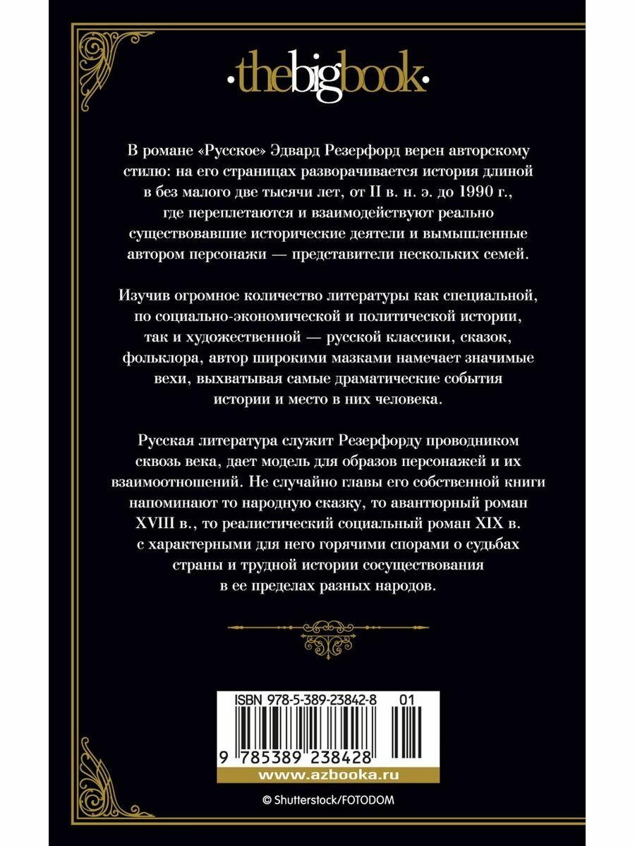 Эдвард Резерфорд — английский писатель, автор мировых бестселлеров «Лондон», «Дублин», «Ирландия», «Нью-Йорк», «Париж» и др. На страницах романа «Русское», романа о России, разворачивается история длиной в без малого две тысячи лет, где переплетаются и взаимодействуют реально существовавшие исторические деятели и вымышленные автором персонажи. Изучив огромное количество литературы, он широкими мазками намечает значимые вехи, выхватывая самые драматические события истории и место в них человека. Русская литература служит Резерфорду проводником сквозь века, дает модель для образов персонажей и их взаимоотношений. Взгляд Резерфорда — это, конечно же, взгляд иностранца, очередного «путешественника на Русь»: разглядывающего, изучающего, желающего установить причины и следствия, искренне пытающегося понять. Этот роман, задуманный и осуществленный в переломный период русской истории и запечатлевший страну, какой писатель увидел ее в конце 1980-х гг., в наши дни тоже стал частью истории. В нем звучит важная для автора тема: сколько бы тяжелых испытаний ни выпало на долю страны и ее жителей, она, словно феникс, возрождается снова.