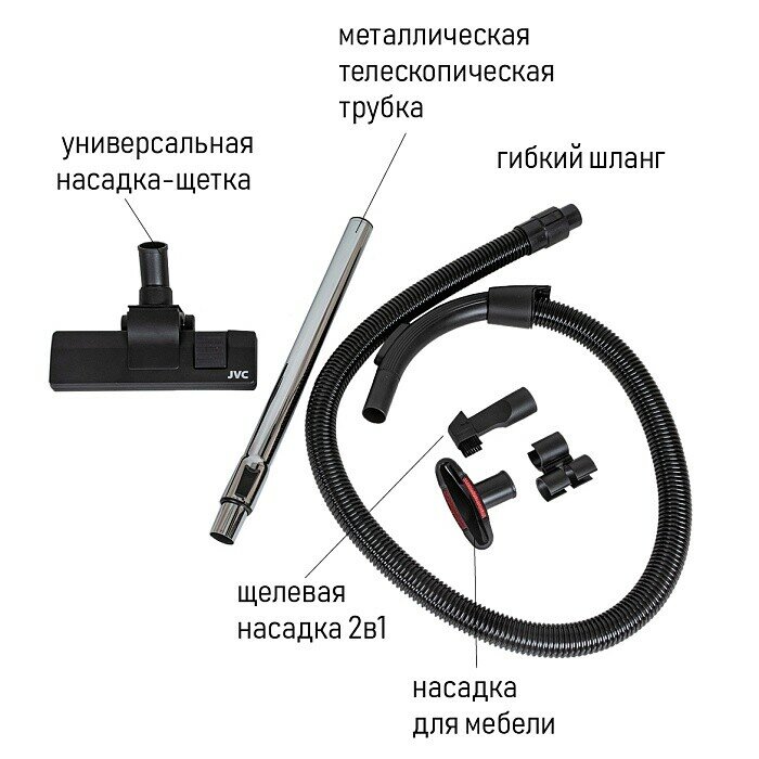 | В комплекте | пылесос, телескопическая трубка, гибкий шланг, щетка пол/ковер, щелевая насадка 2 в 1, насадка для мягкой мебели, держатель для аксессуаров, гарантийный талон, инструкция на русском языке |