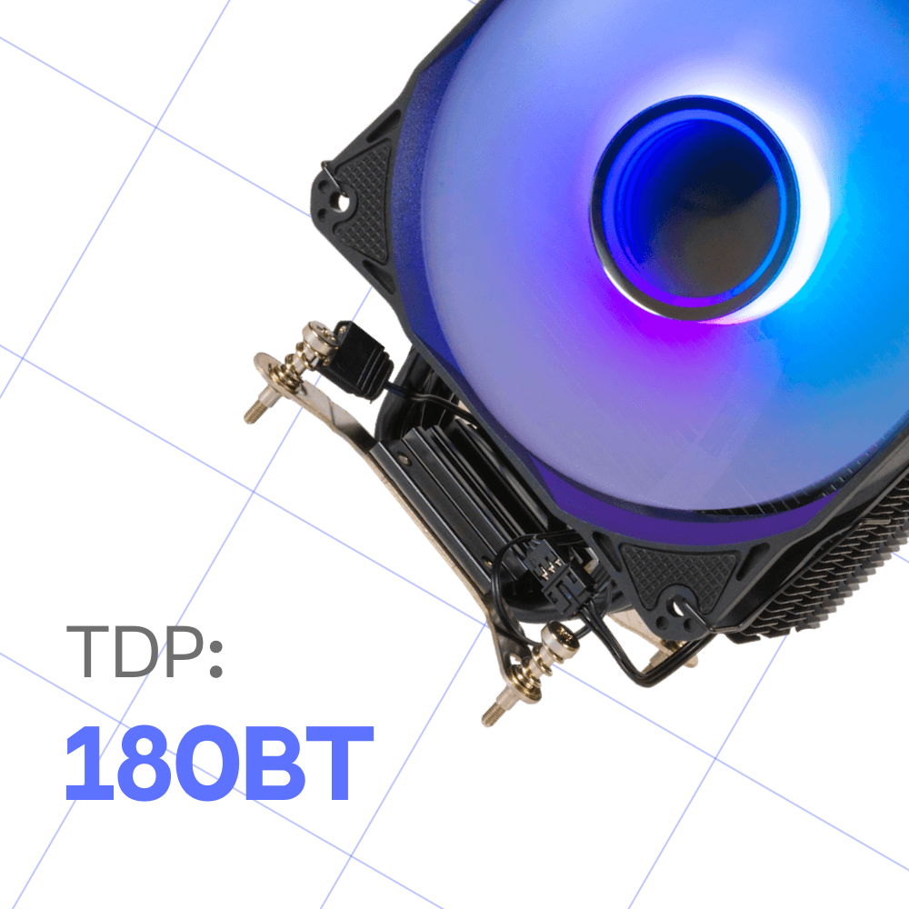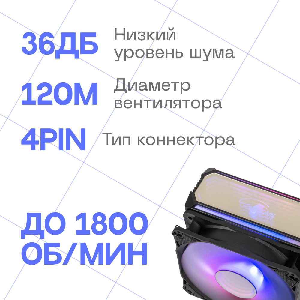 Кулер оснащен 120-мм вентилятором с регулируемой скоростью вращения от 800 до 1800 оборотов в минуту. Максимальный воздушный поток составляет 79,02 CFM, что гарантирует быстрое и эффективное охлаждение. Максимальный уровень шума составляет всего 36 дБ, что делает кулер практически бесшумным.