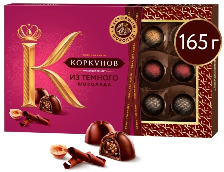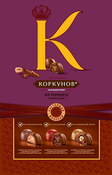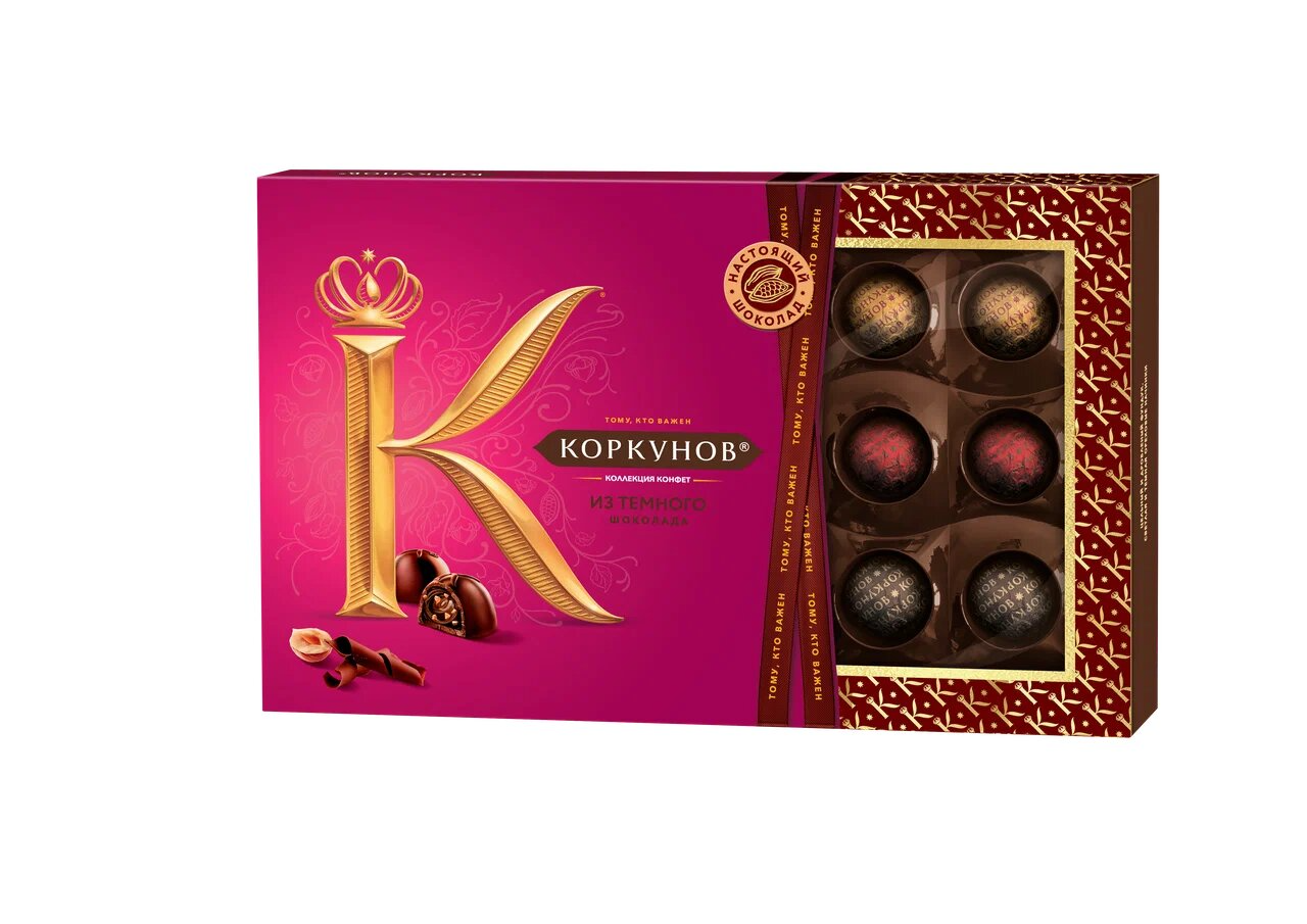 Коллекция шоколадных конфет Коркунов изысканный и необычайно вкусный комплимент для Ваших коллег и партнеров, а также утонченный подарок для тех, кто Вам особенно важен. Удивительная и гармоничная композиция, составленная из разнообразных сочетаний настоящего темного и молочного шоколада, цельного и дробленого фундука, ореховой начинки и вафельной крошки. Выберите лишь повод, а подарок всё скажет за Вас.