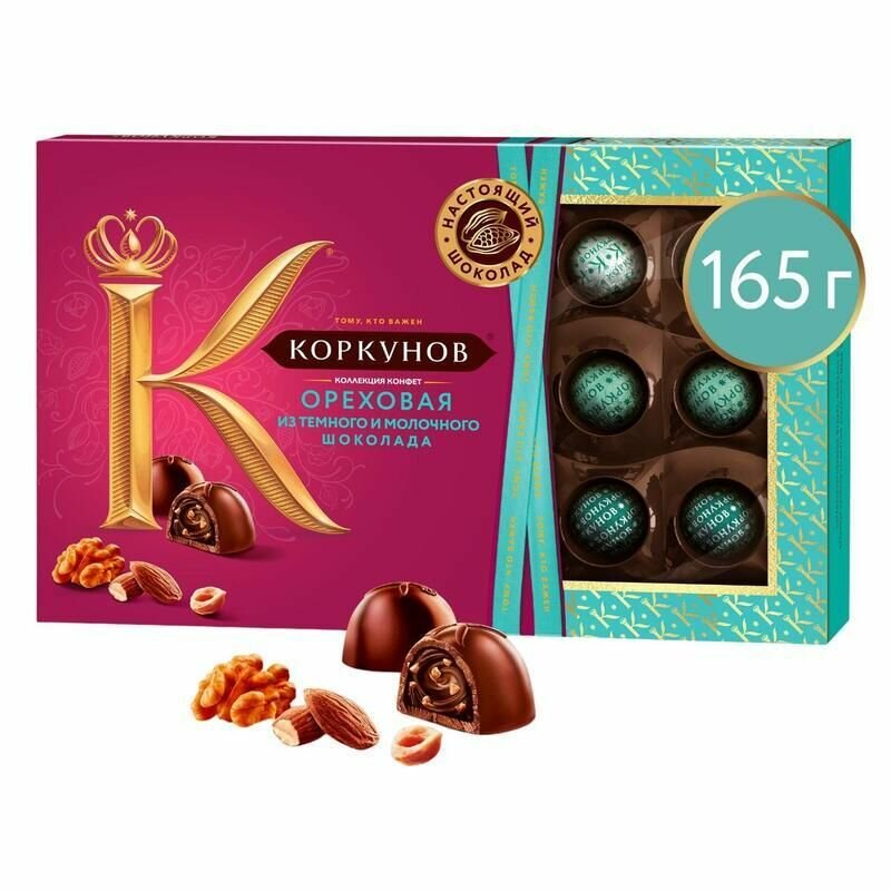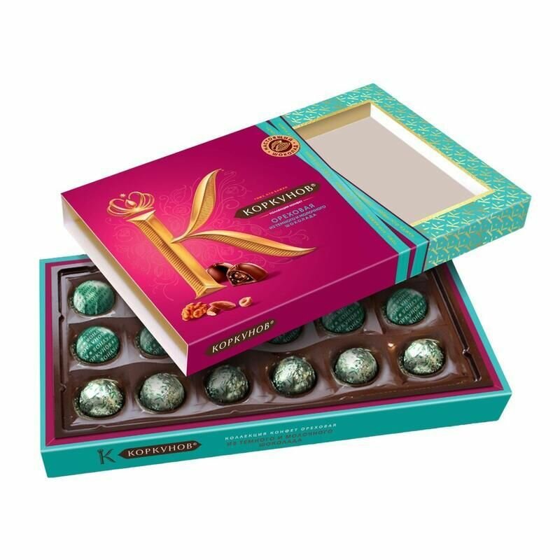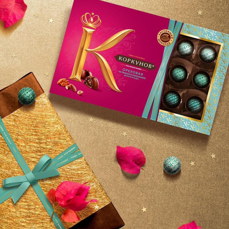 Коллекция шоколадных конфет Коркунов изысканный и необычайно вкусный комплимент для Ваших коллег и партнеров, а также утонченный подарок для тех, кто Вам особенно важен. Удивительная и гармоничная композиция, составленная из разнообразных сочетаний настоящего шоколада, карамелизированного грецкого ореха, миндаля и фундука, а также темной ореховой начинки со вкусом кленового сиропа и апельсина.