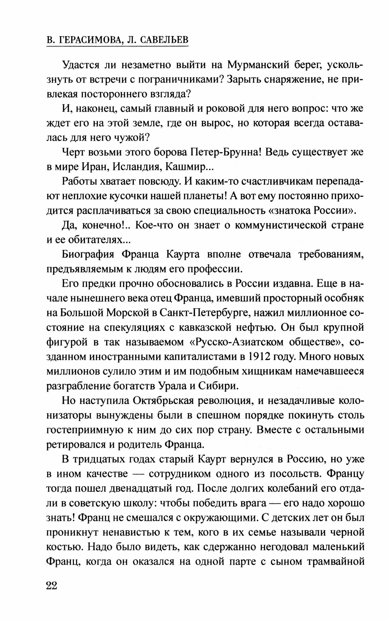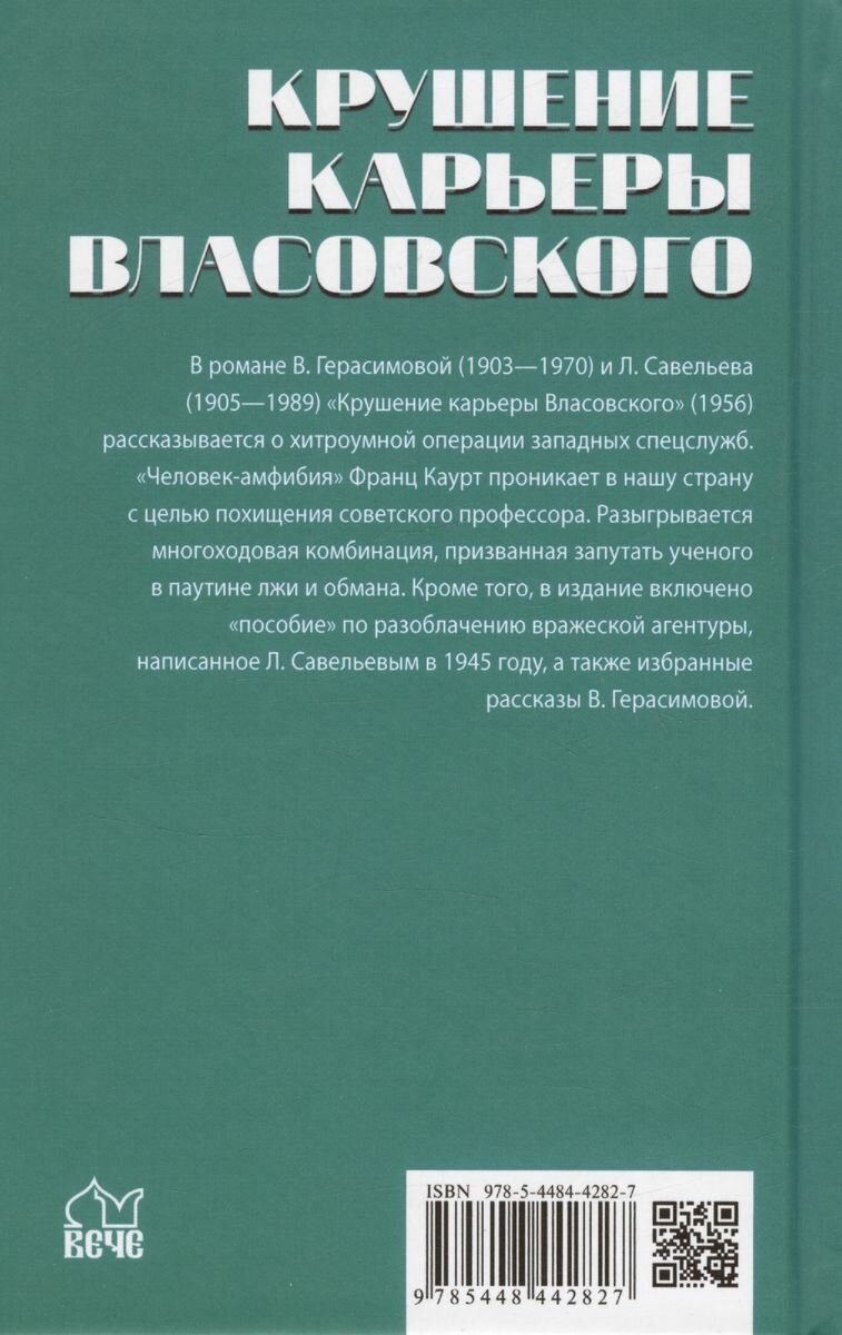 В романе В. Герасимовой (1903-1970) и Л. Савельева (1905-1989) "Крушение карьеры Власовского" (1956) рассказывается о хитроумной операции западных спецслужб. "Человек-амфибия" Франц Каурт проникает в нашу страну с целью похищения советского профессора. Разыгрывается многоходовая комбинация, призванная запутать ученого в паутине лжи и обмана. Кроме того, в издание включено "пособие" по разоблачению вражеской агентуры, написанное Л. Савельевым в 1945 году, а также избранные рассказы В. Герасимовой.